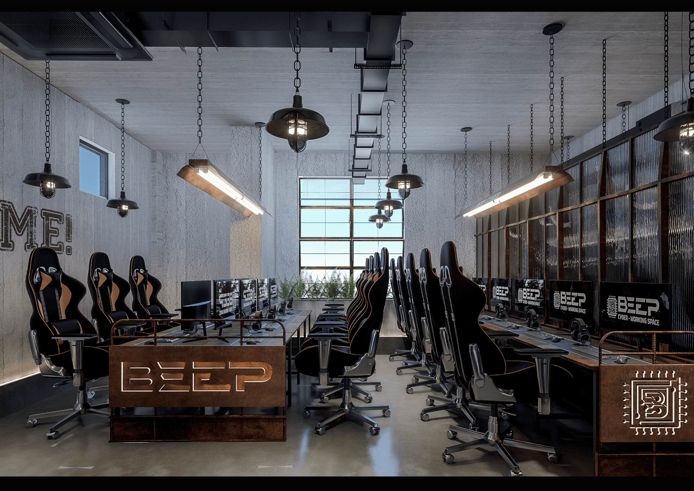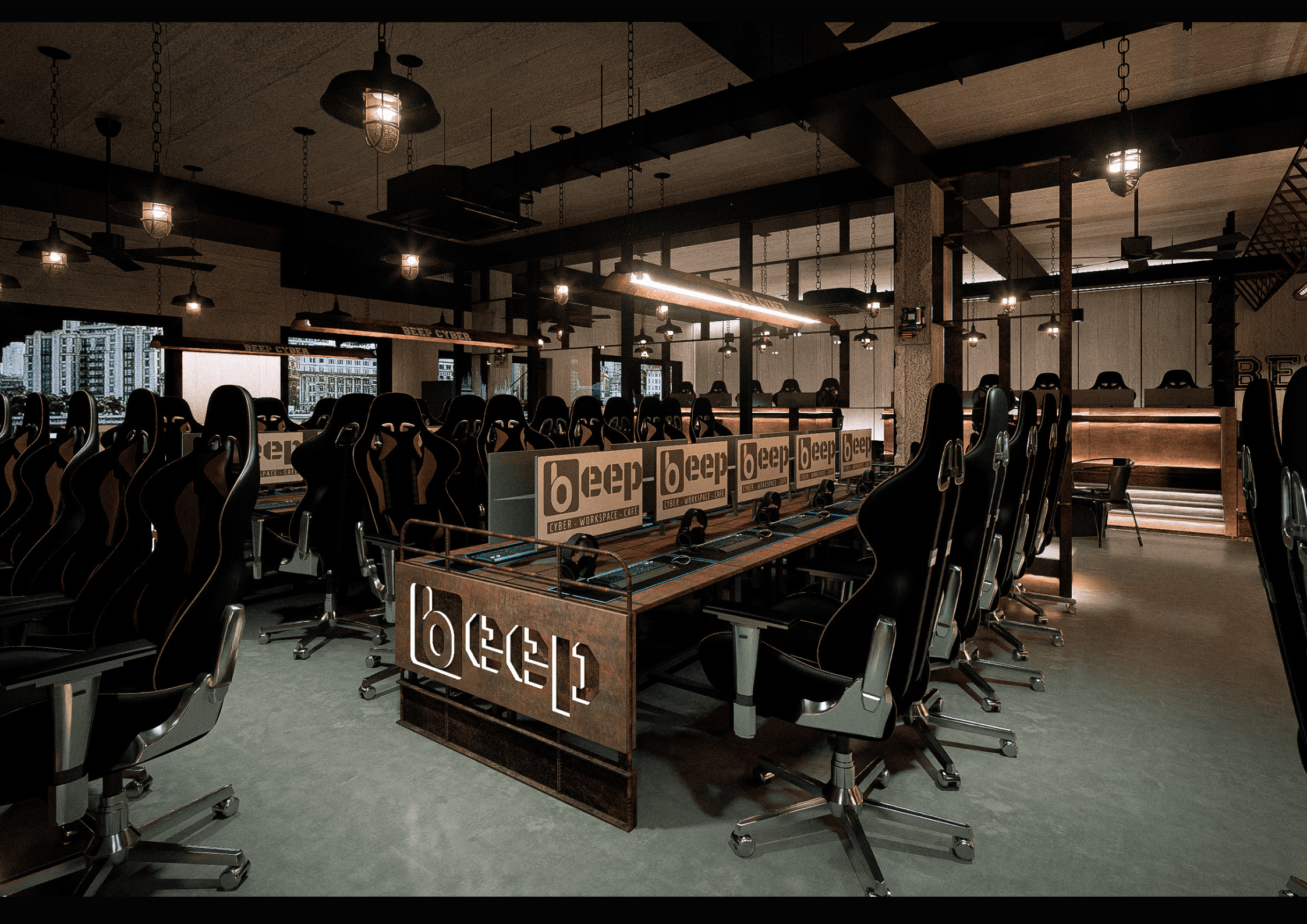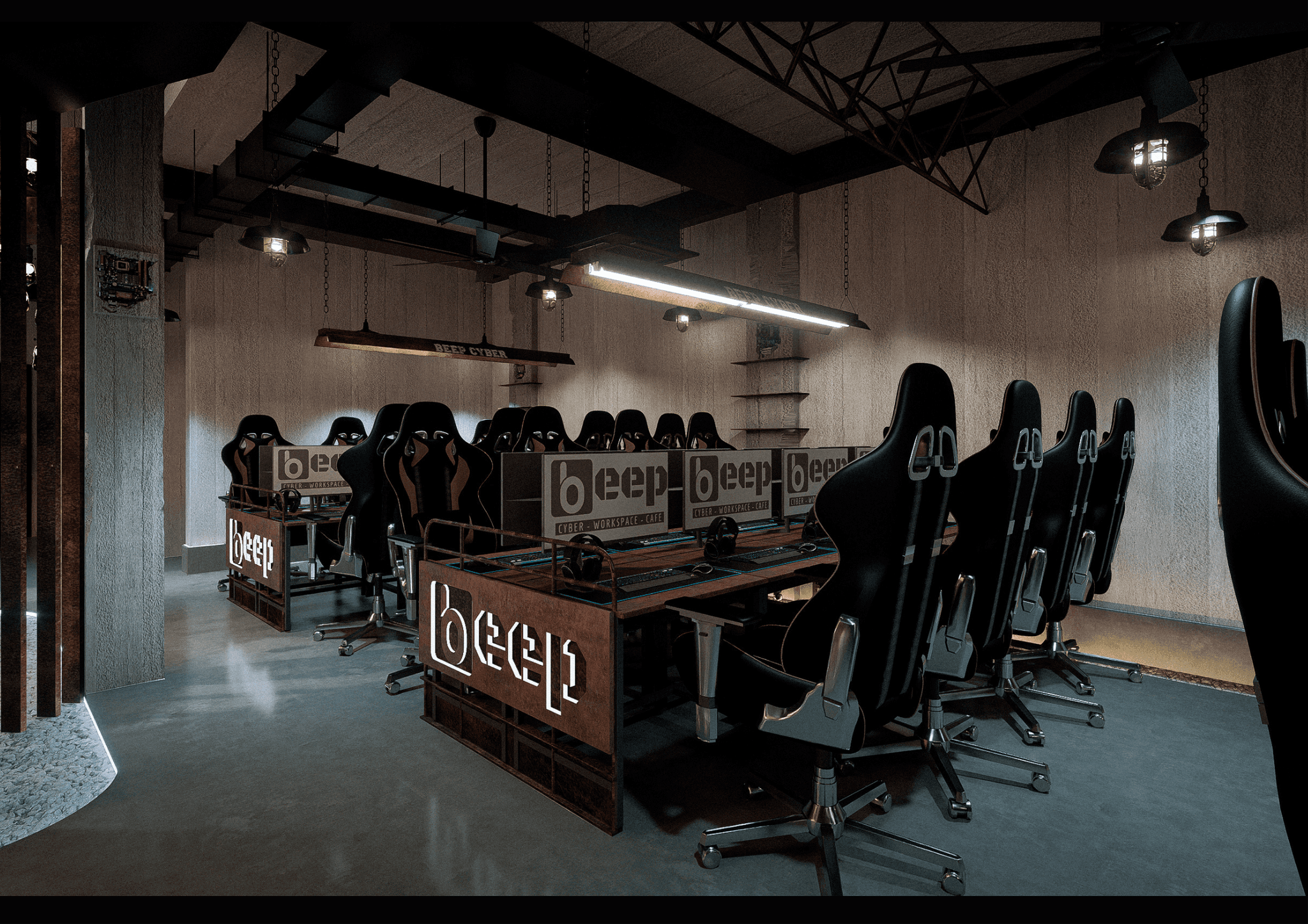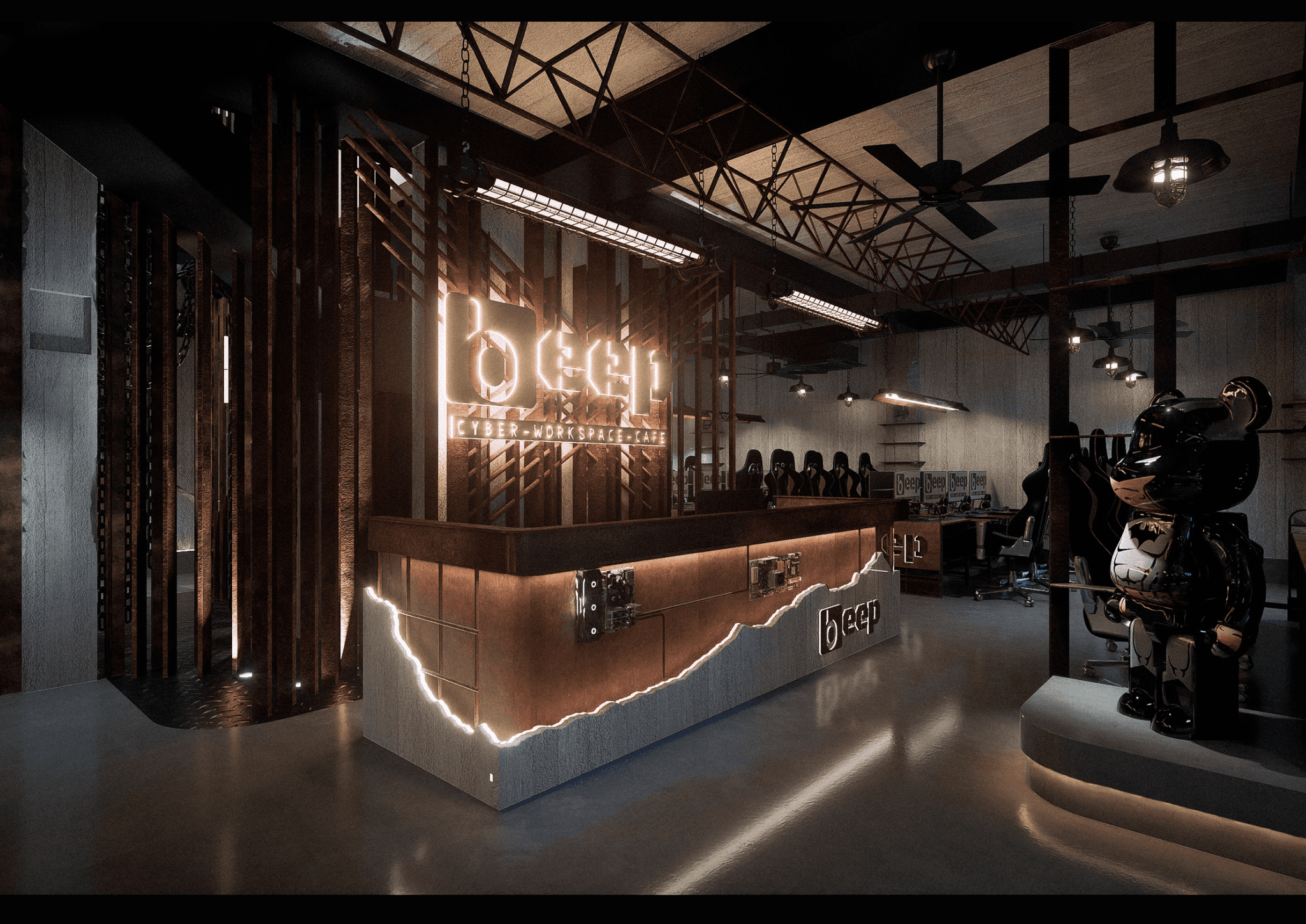 BEEP hướng đến việc tạo dựng một Cyber Workspace Café mang phong cách Industrial hiện đại, nơi ranh giới giữa làm việc, giải trí và sáng tạo được xóa nhòa. Không gian được thiết kế với tone đen chủ đạo, ánh sáng điểm nhấn và vật liệu kim loại thô, phản ánh tinh thần mạnh mẽ và năng động của cộng đồng công nghệ – game thủ.