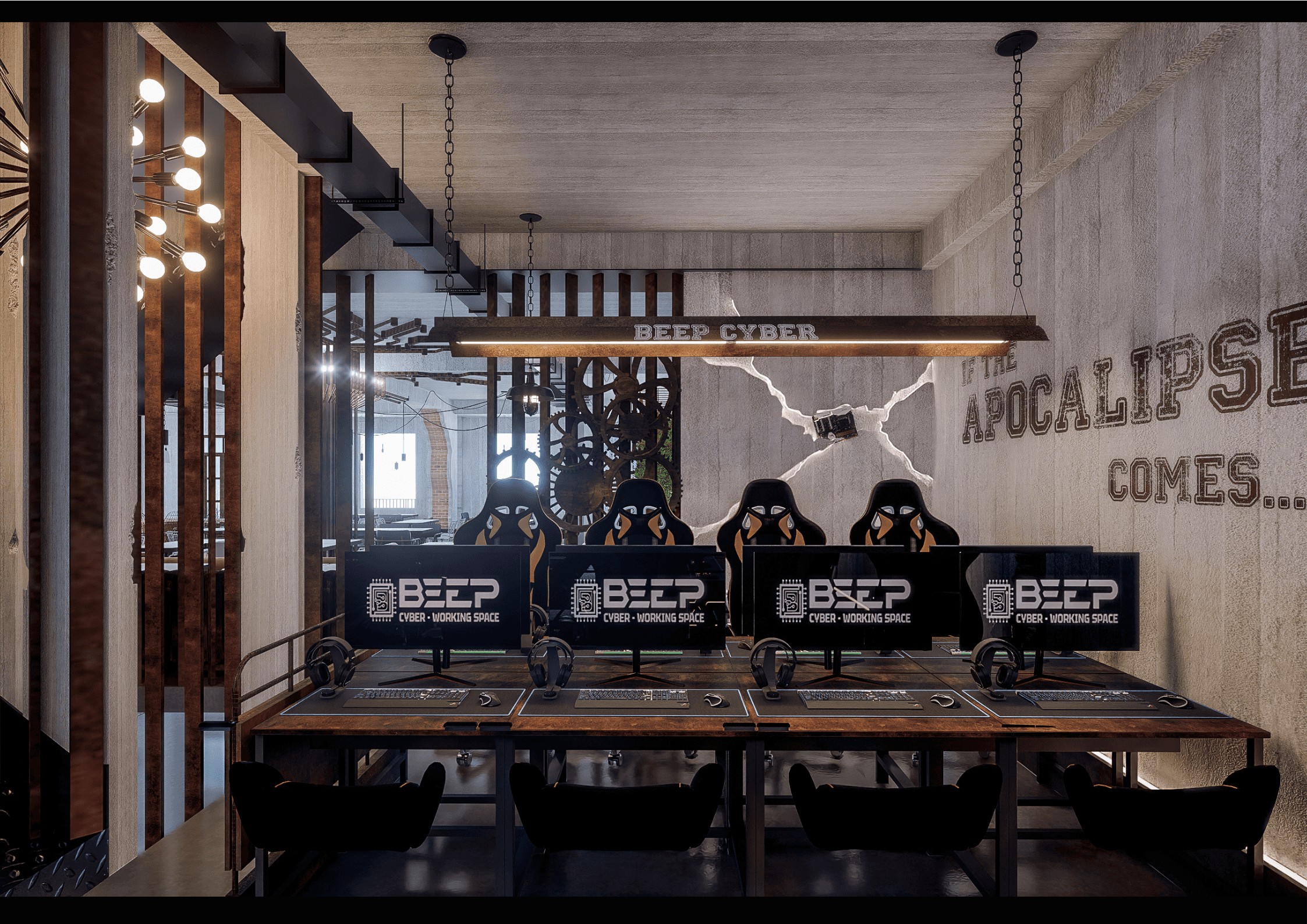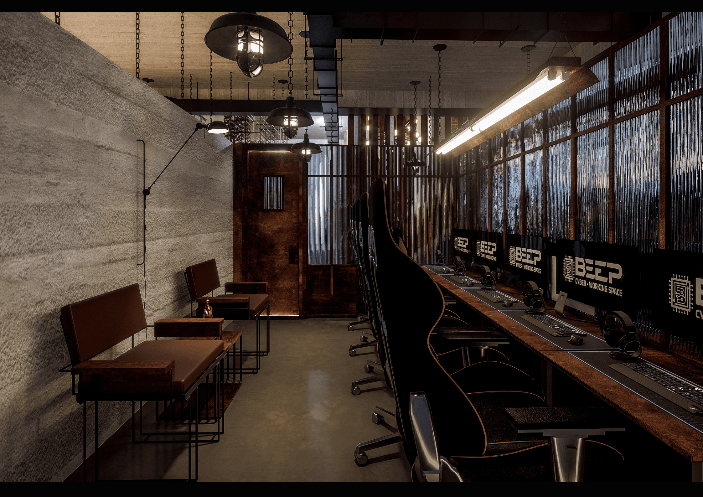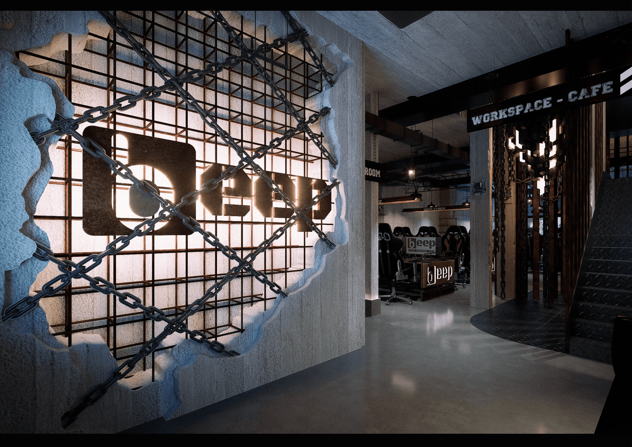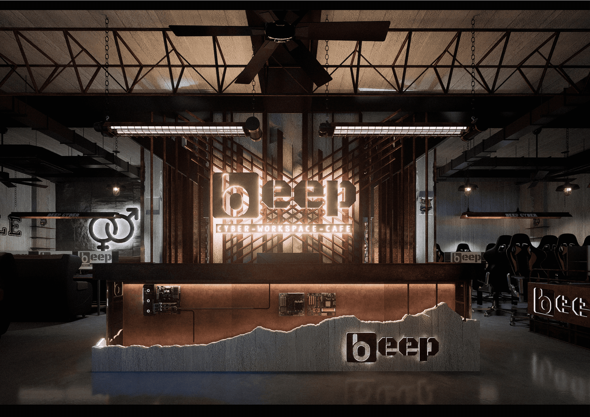 BEEP hướng đến việc tạo dựng một Cyber Workspace Café mang phong cách Industrial hiện đại, nơi ranh giới giữa làm việc, giải trí và sáng tạo được xóa nhòa. Không gian được thiết kế với tone đen chủ đạo, ánh sáng điểm nhấn và vật liệu kim loại thô, phản ánh tinh thần mạnh mẽ và năng động của cộng đồng công nghệ – game thủ.