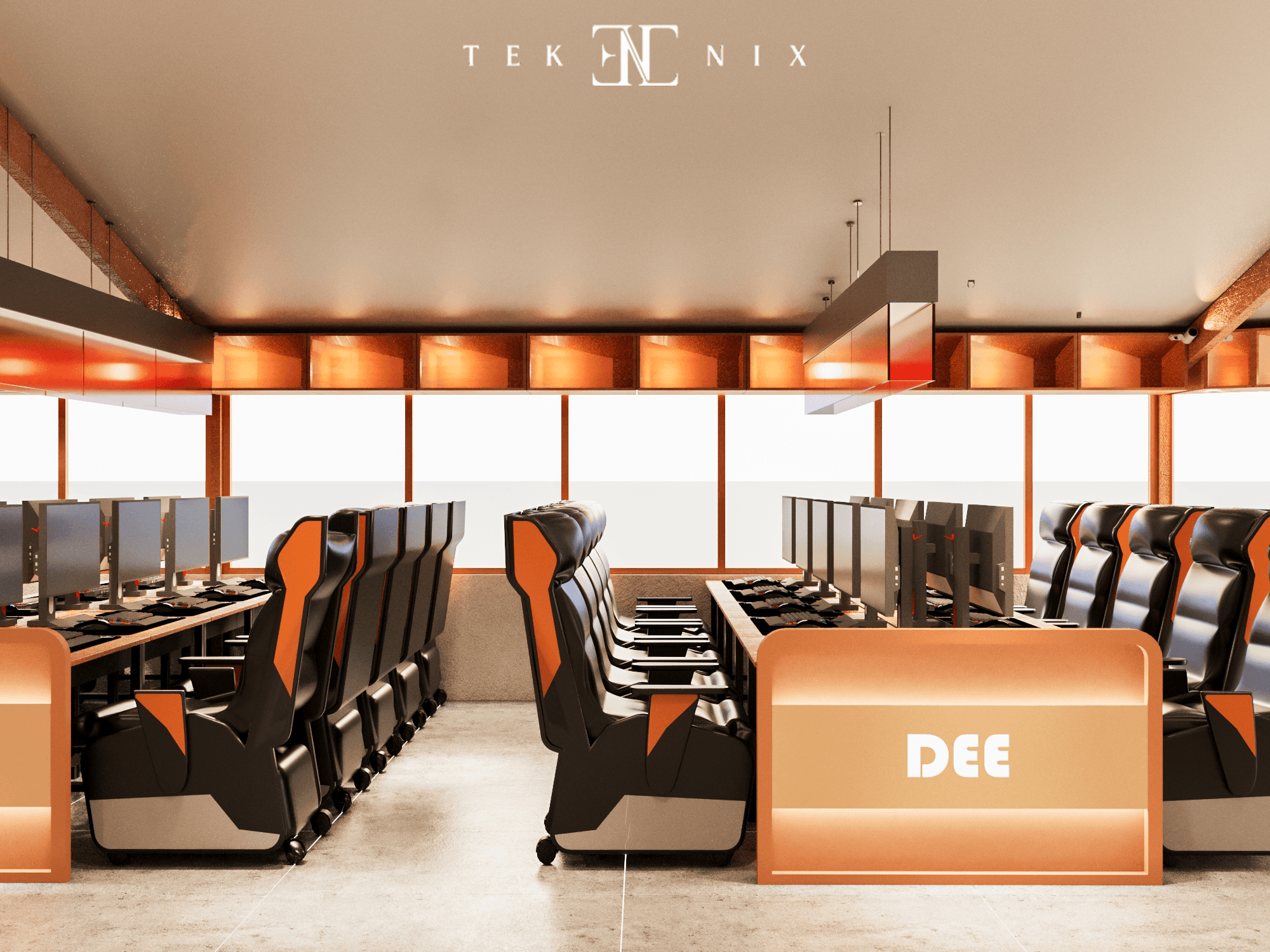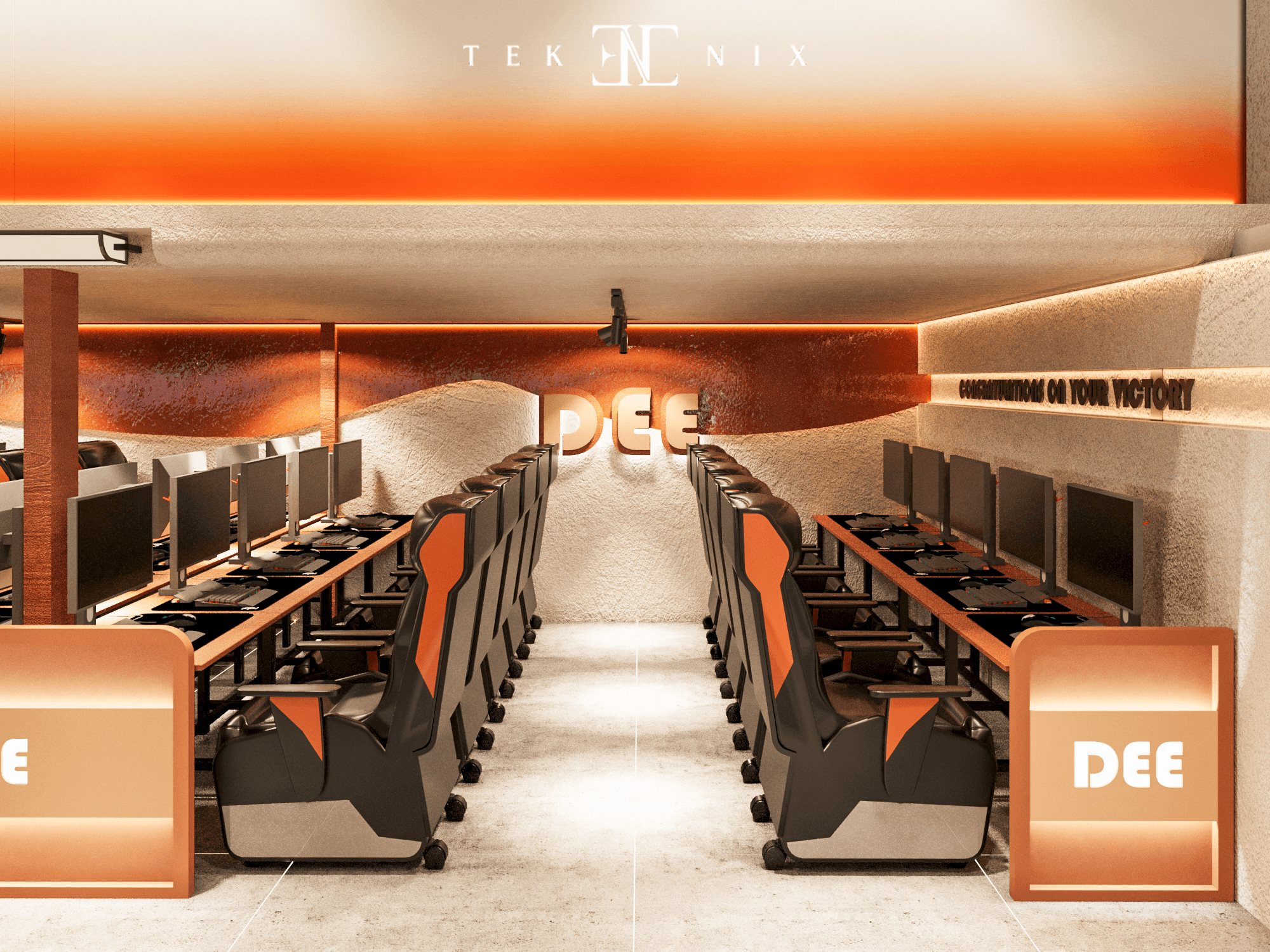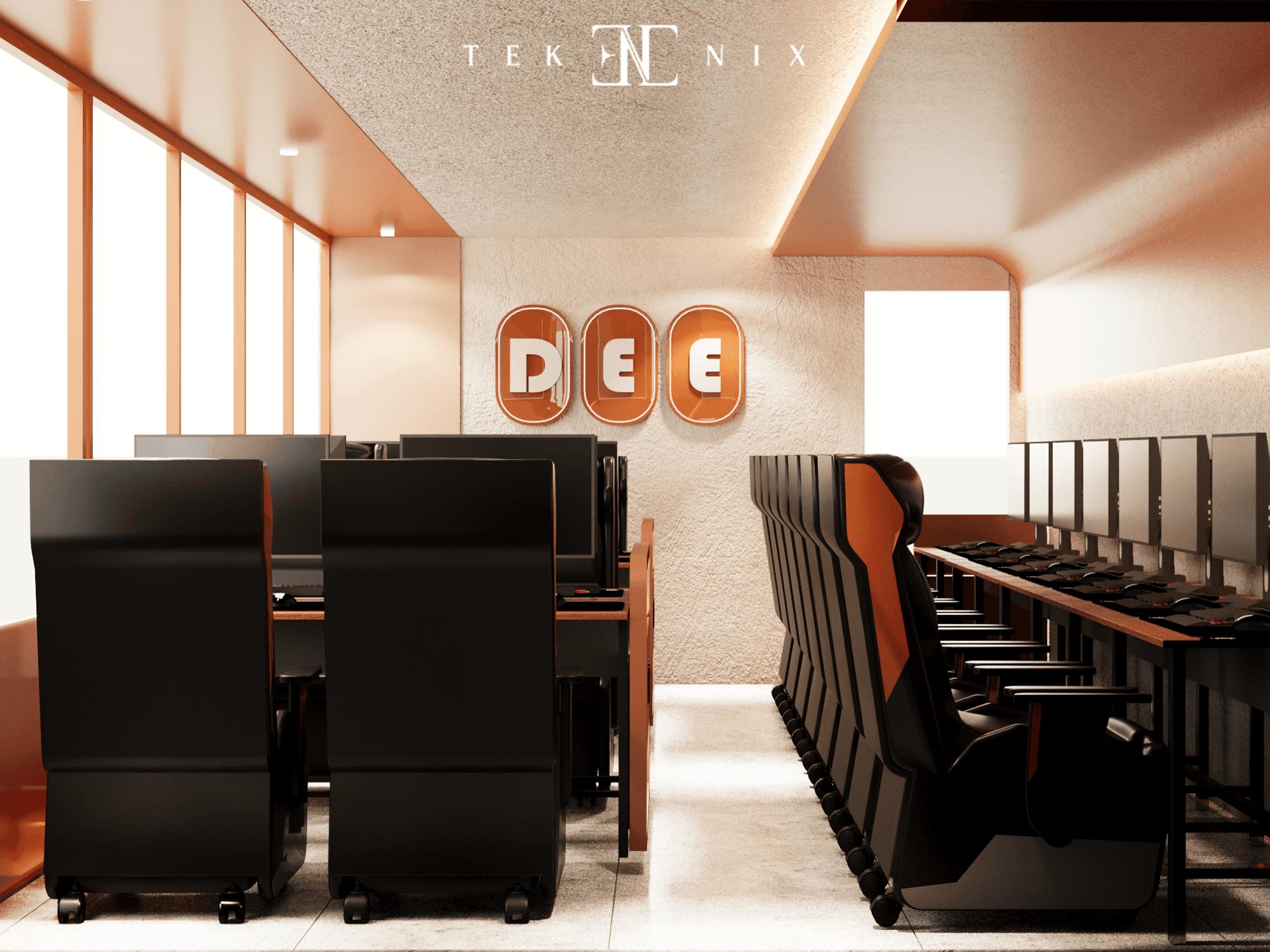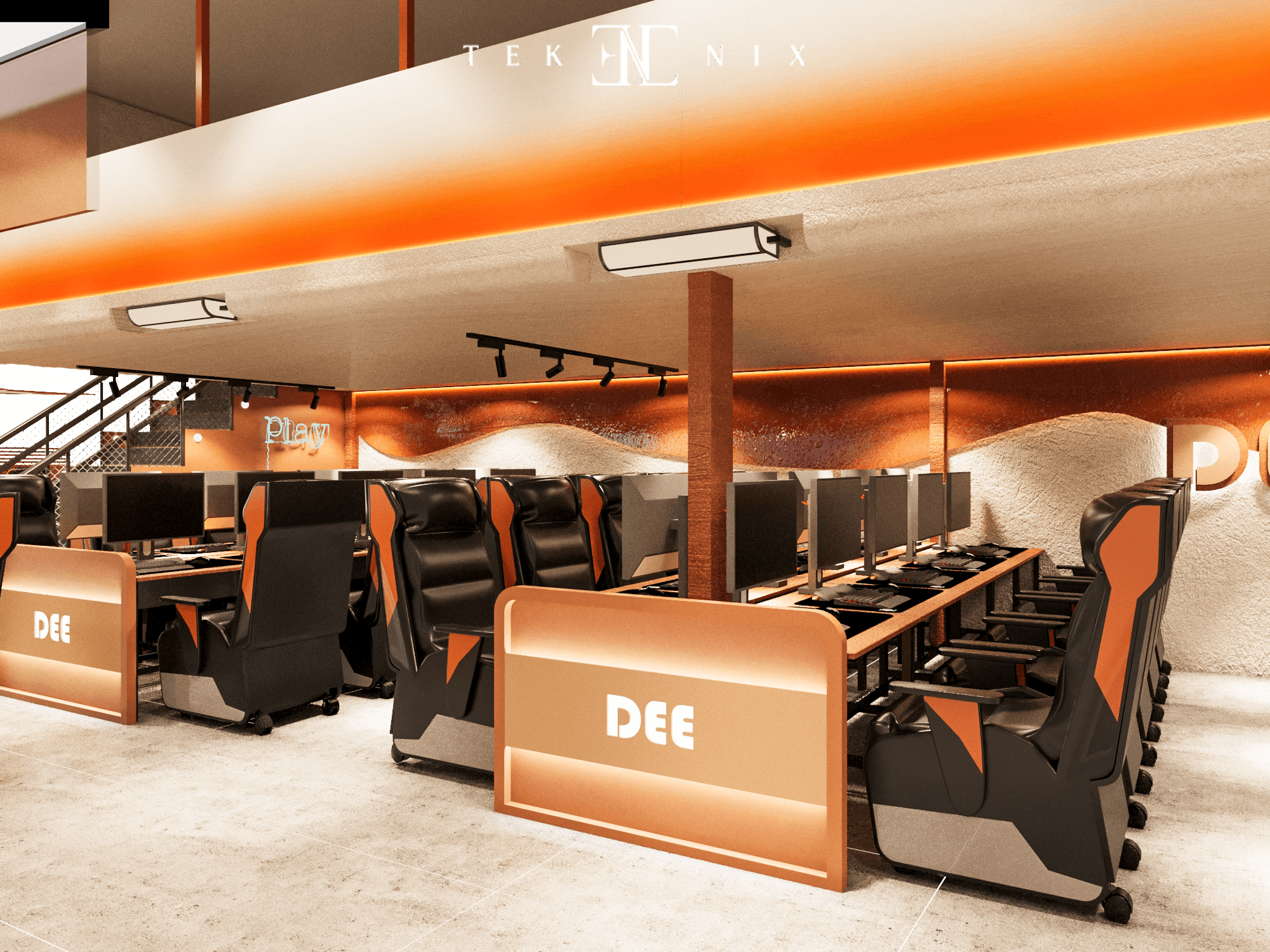 Không gian DEE NET Cyber Game được thiết kế theo tinh thần năng động và hiện đại, nổi bật với gam màu cam – đen đặc trưng thương hiệu DEE. Hệ đèn LED và đèn ray tạo chiều sâu ánh sáng, nhấn mạnh tinh thần esports. Nội thất gaming chuyên dụng, bố trí khoa học, kết hợp vật liệu terrazzo và mảng tường xi măng mang lại cảm giác mạnh mẽ, trẻ trung và giàu trải nghiệm.