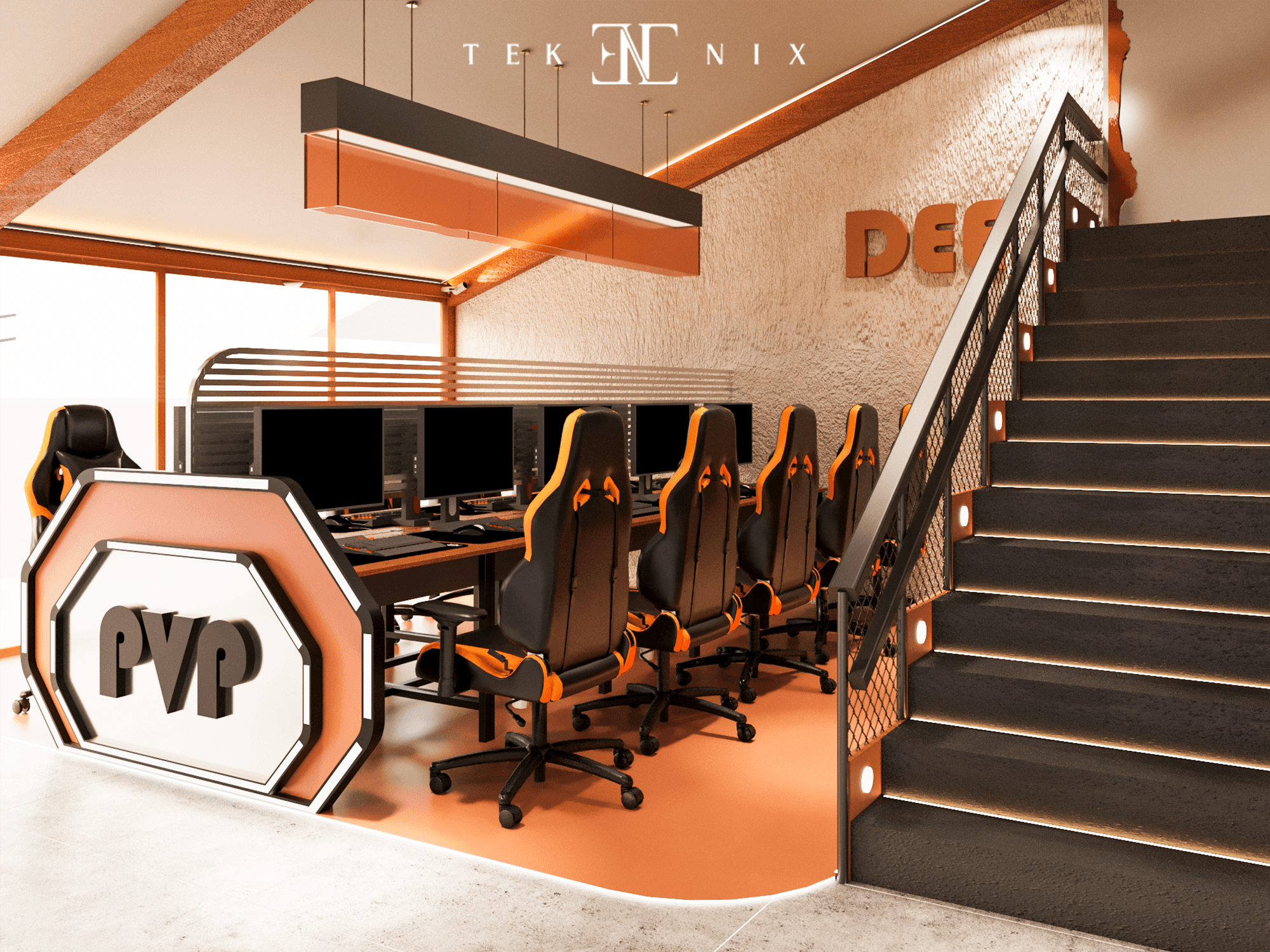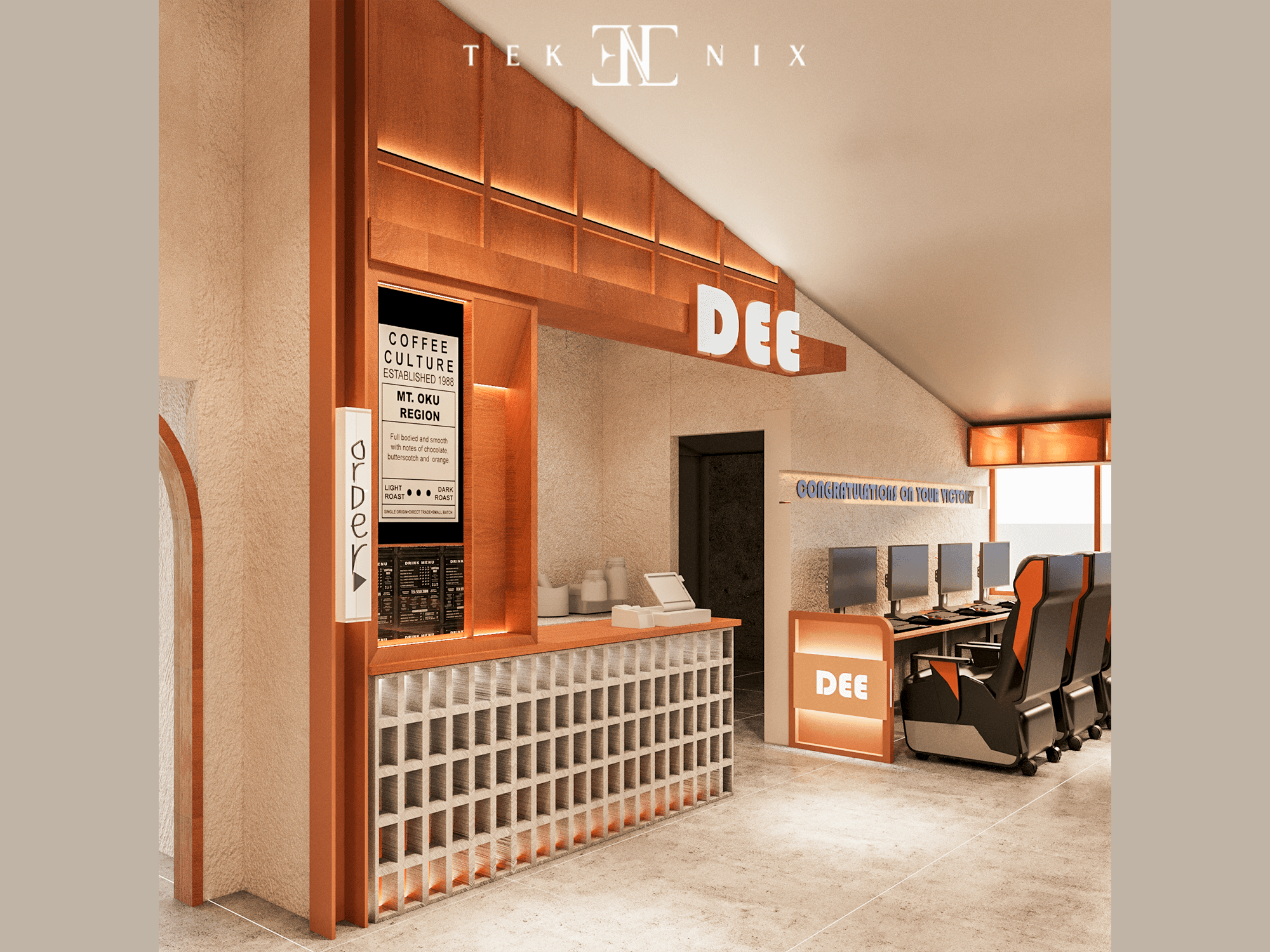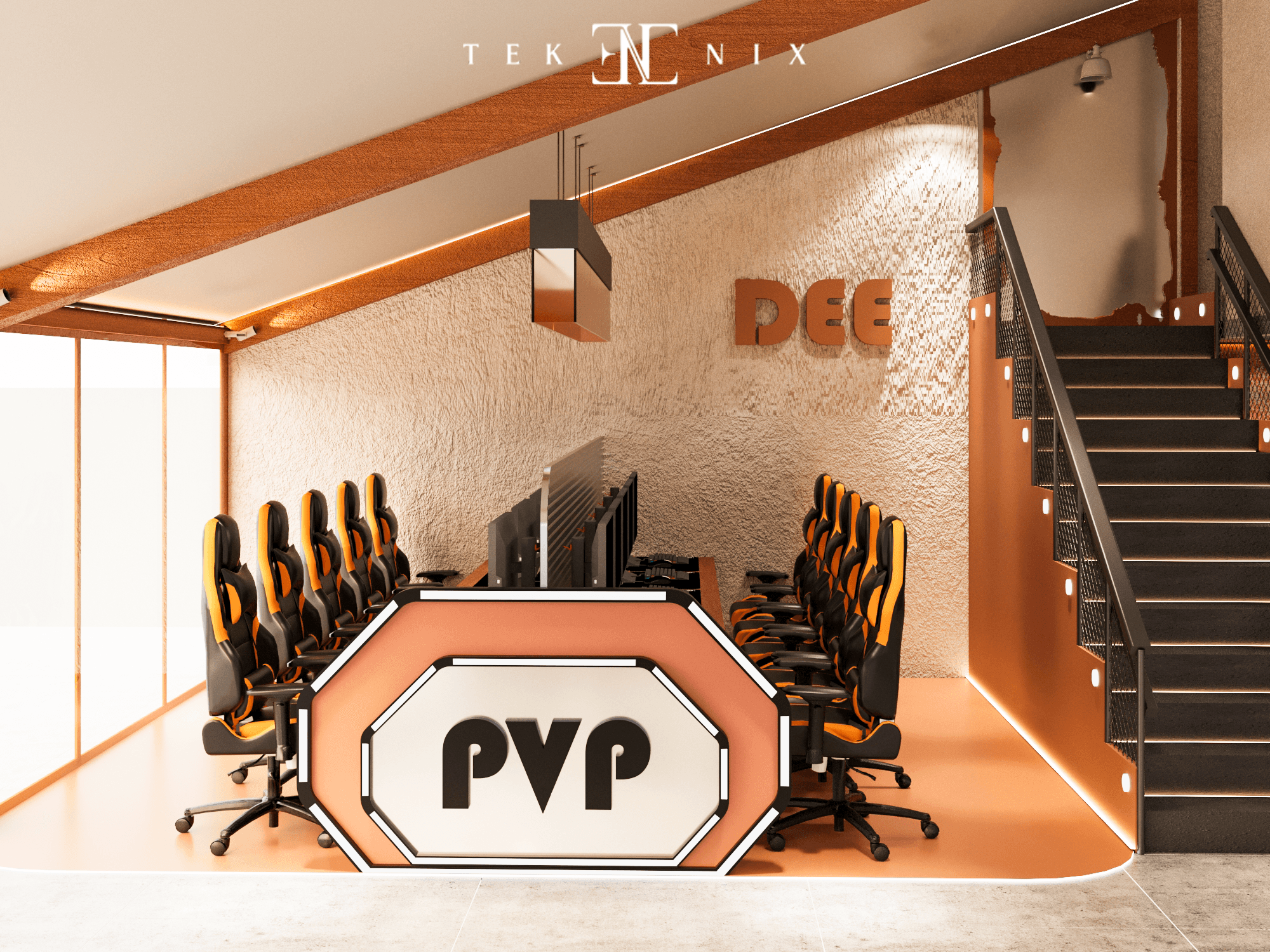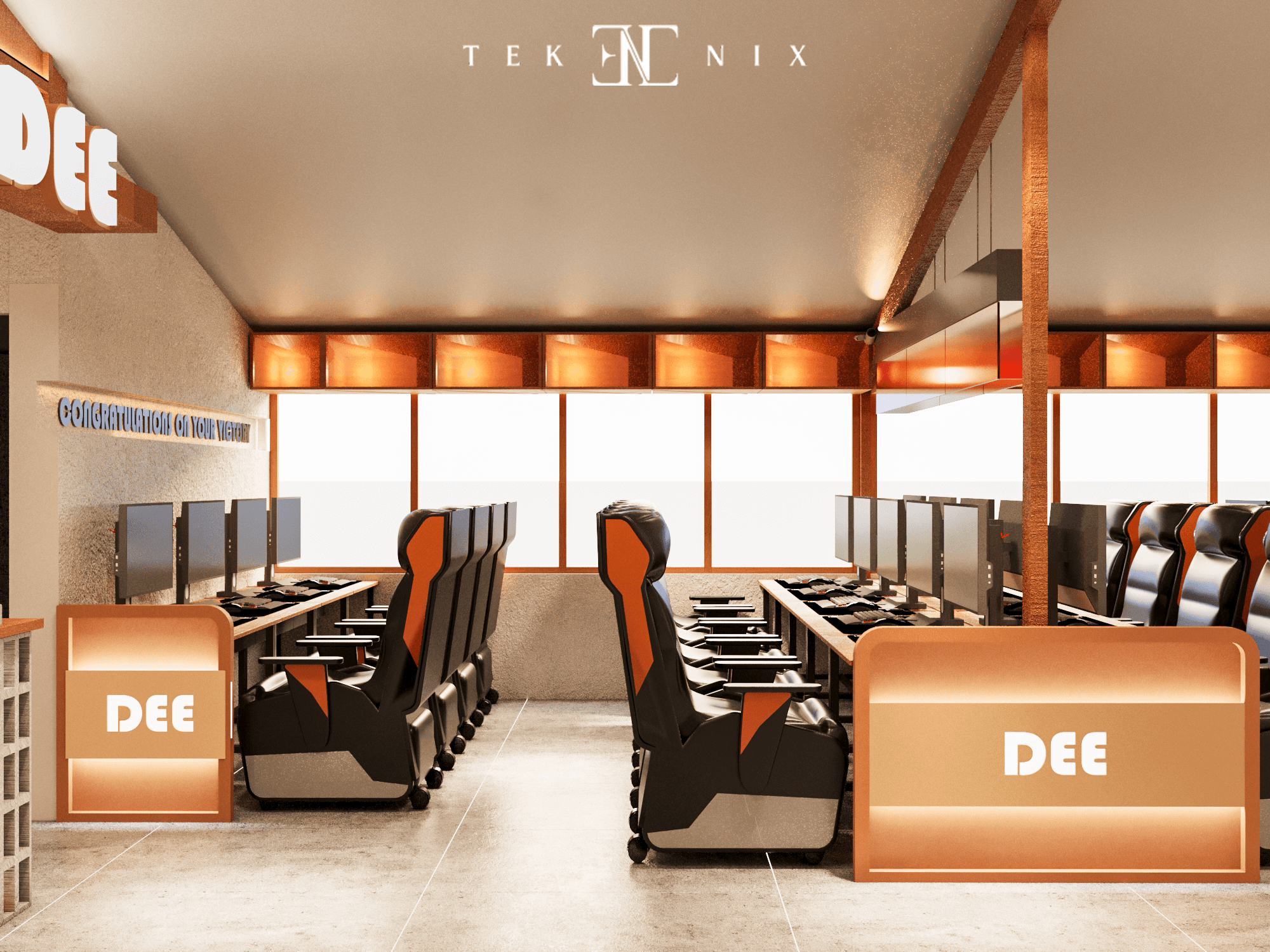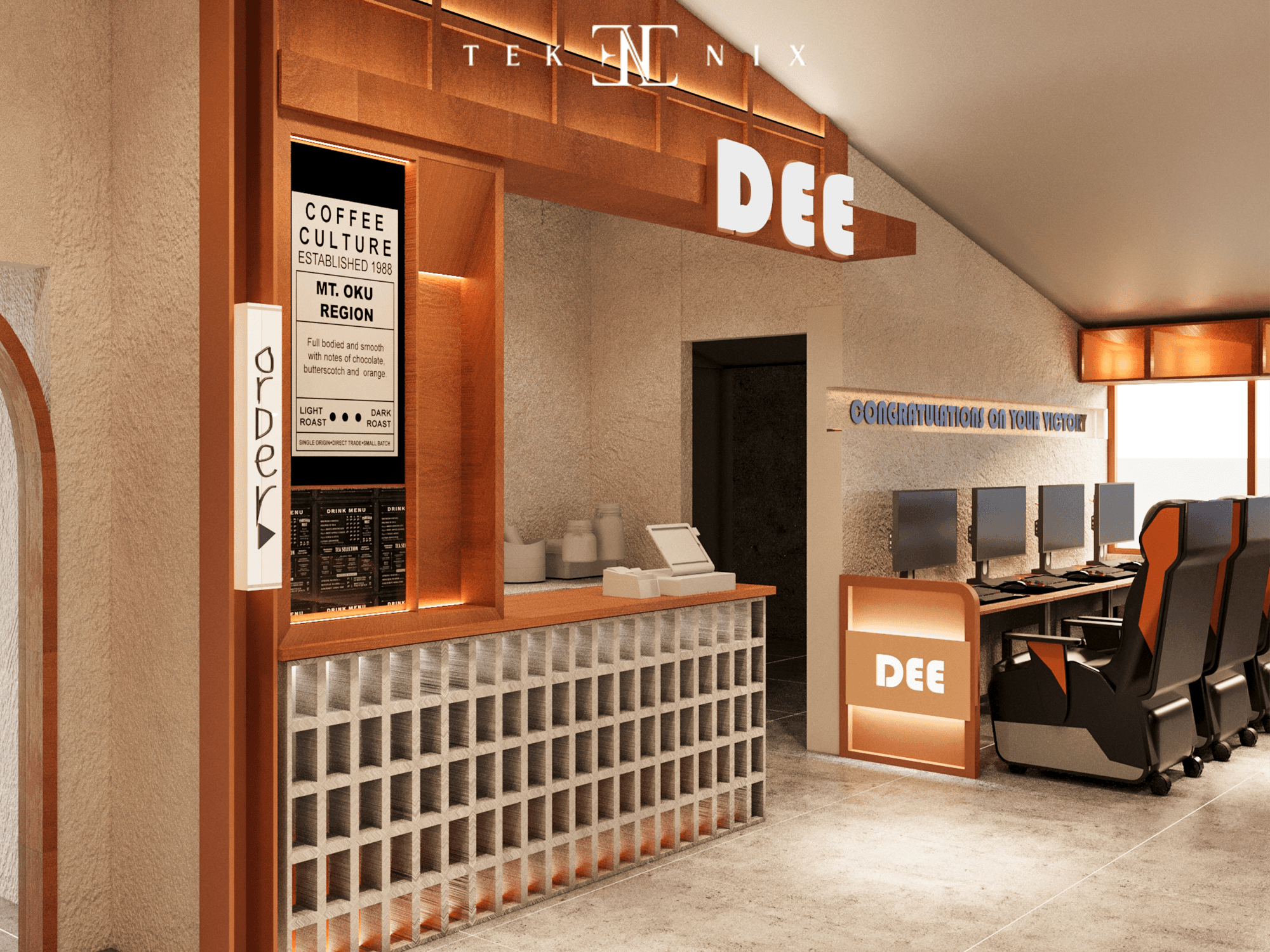 Không gian DEE NET Cyber Game được thiết kế theo tinh thần năng động và hiện đại, nổi bật với gam màu cam – đen đặc trưng thương hiệu DEE. Hệ đèn LED và đèn ray tạo chiều sâu ánh sáng, nhấn mạnh tinh thần esports. Nội thất gaming chuyên dụng, bố trí khoa học, kết hợp vật liệu terrazzo và mảng tường xi măng mang lại cảm giác mạnh mẽ, trẻ trung và giàu trải nghiệm.