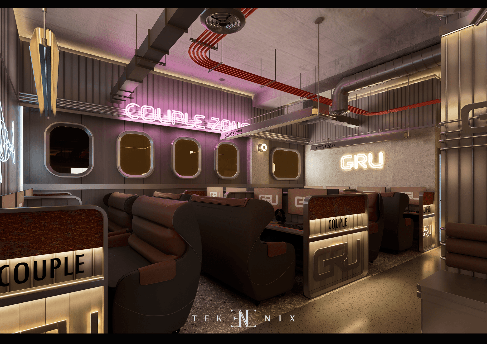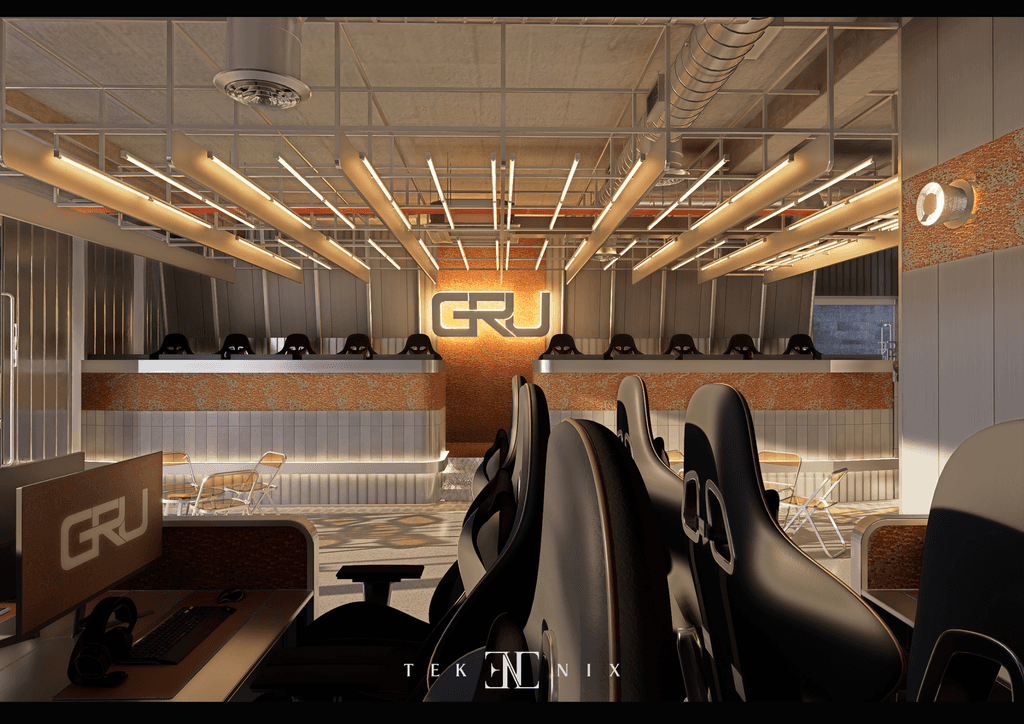 GRU Cyber mang phong cách Industrial Game Zone mạnh mẽ và thô mộc, kết hợp hoàn hảo giữa công nghiệp và hiện đại. Không gian nổi bật với trần bê tông, gạch nung đỏ, và hệ thống ống kỹ thuật lộ thiên, tạo cảm giác chân thực và năng động. Các khu FPS, VIP, Standard Zone được bố trí khoa học, cùng ánh sáng LED công nghiệp và bảng hiển thị điện tử, mang lại trải nghiệm chuyên nghiệp – hiệu suất – đậm chất game thủ.