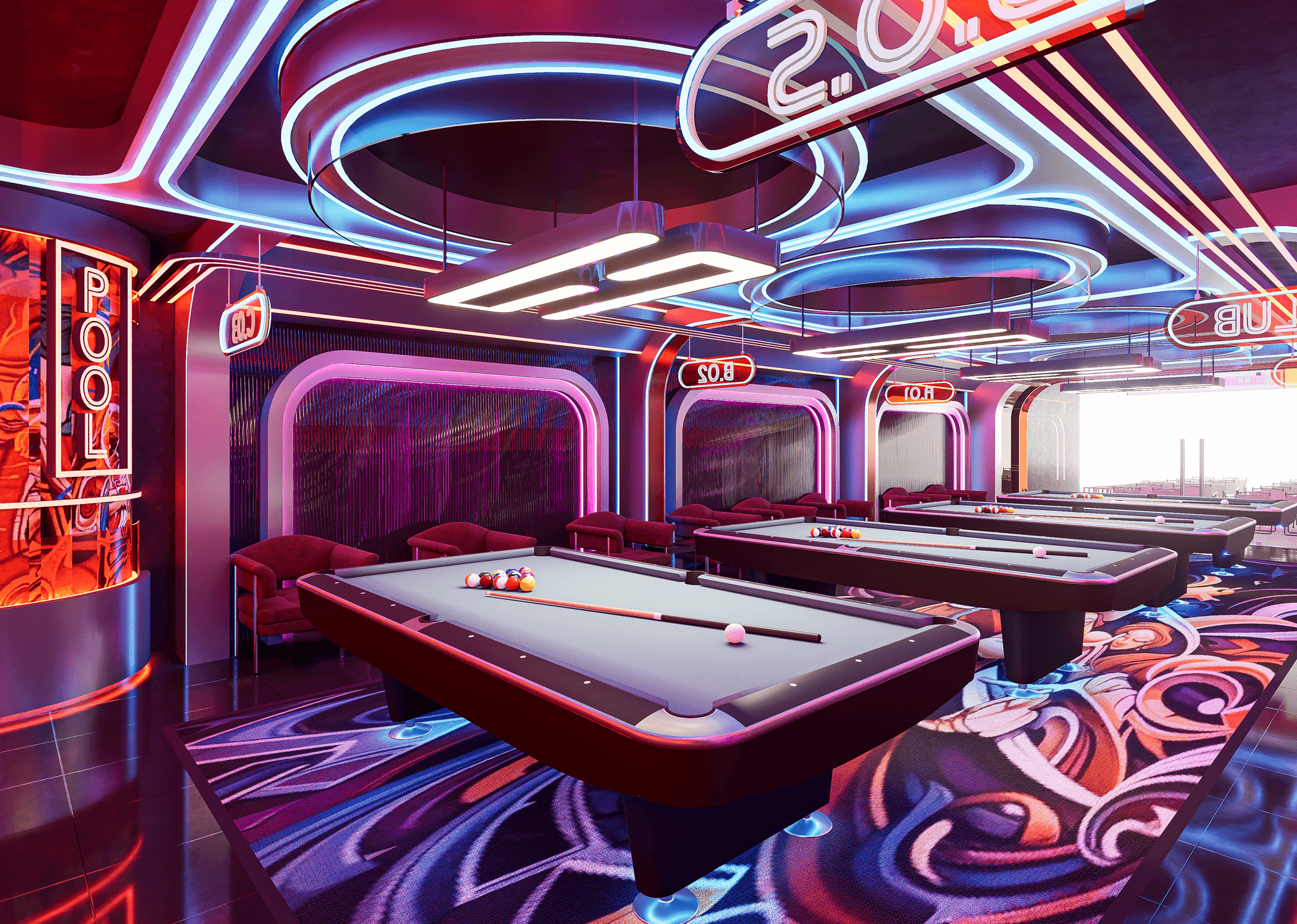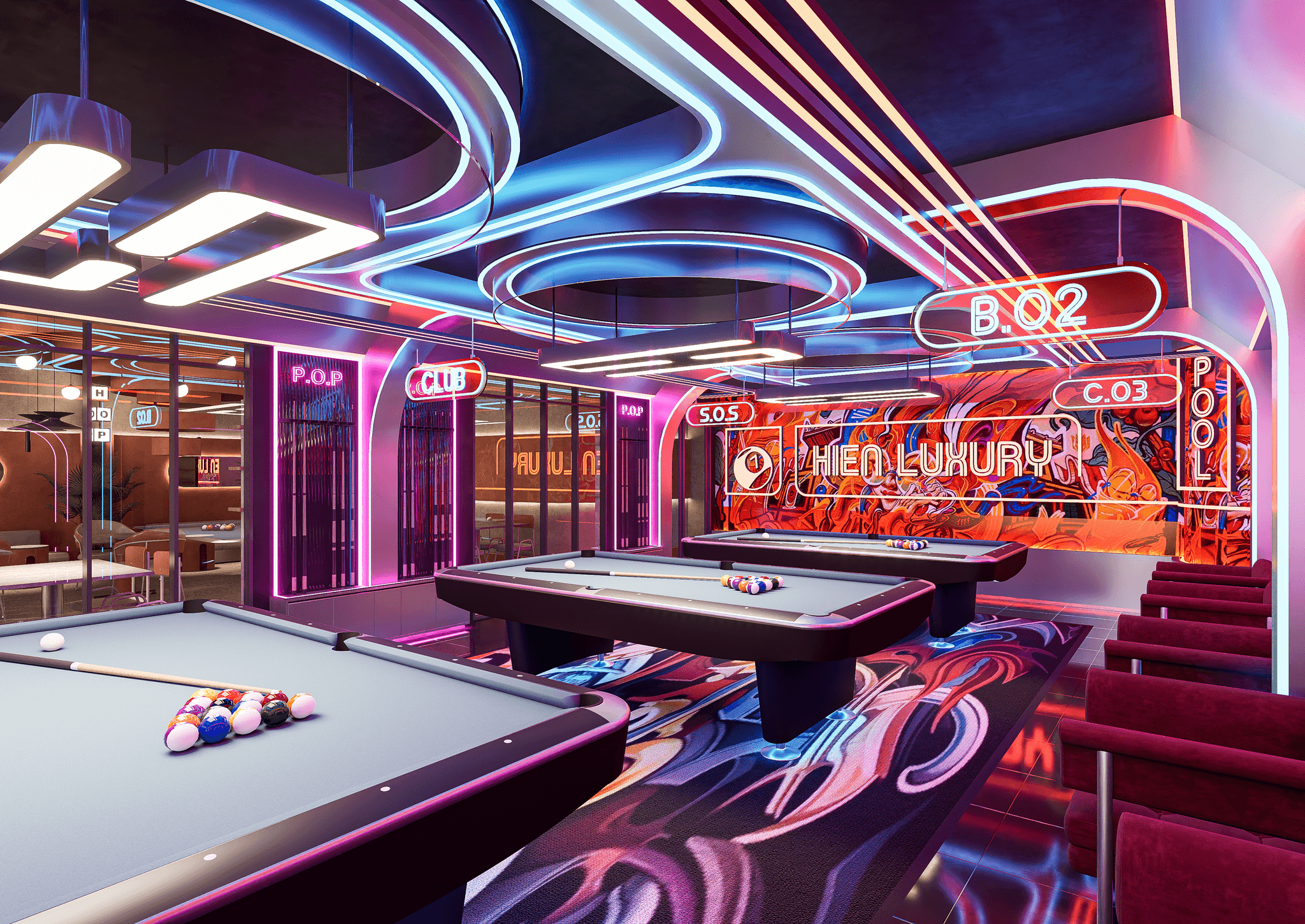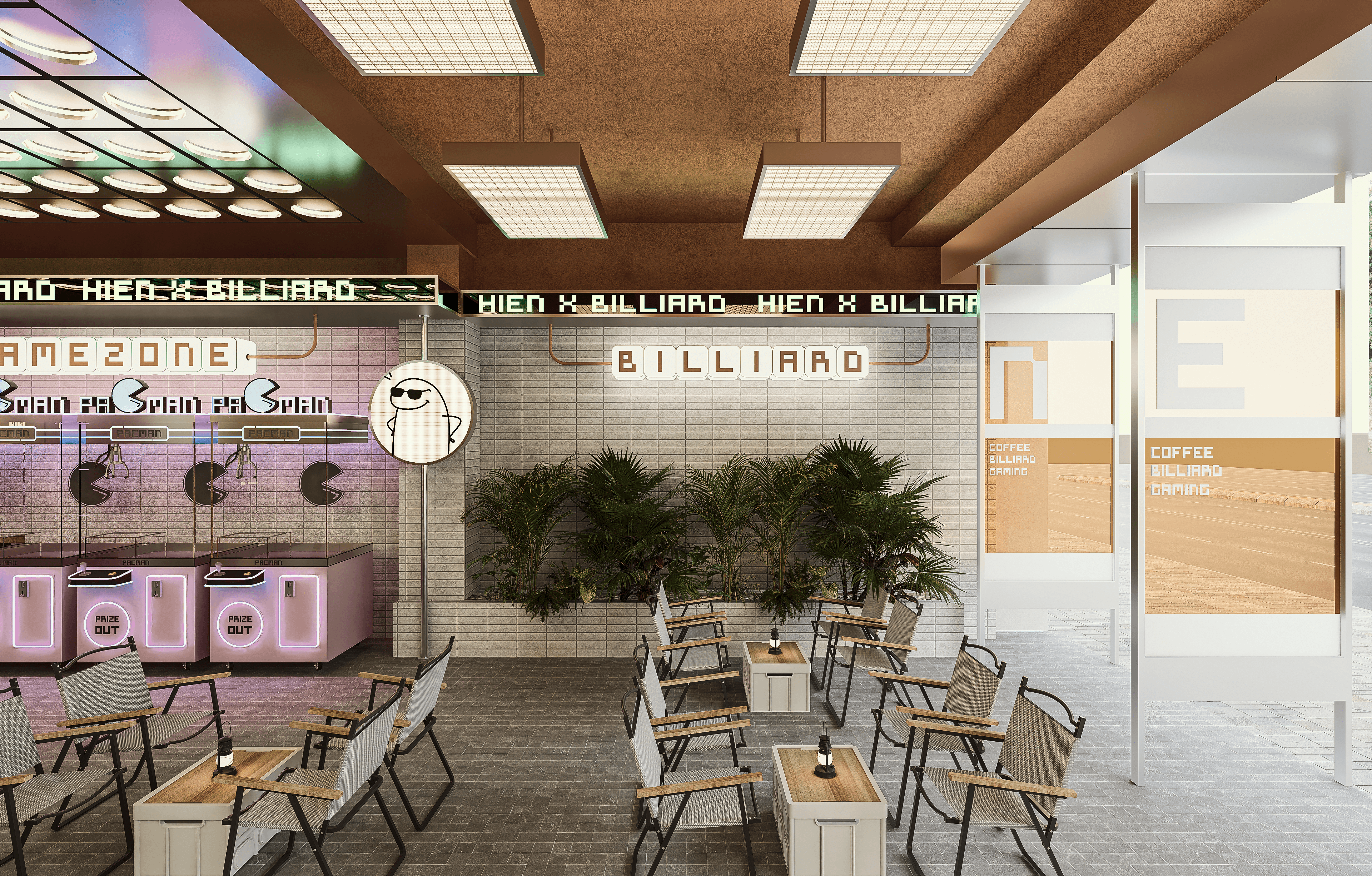 Không gian gắn kết cảm xúc: Thiết kế mở giữa khu bida và cafe tạo dòng chảy tự nhiên. ánh sáng ấm và nội thất mềm mại giúp khách hàng thư giãn. đồng thời tăng trải nghiệm giải trí, kết nối và tương tác trong quá trình sử dụng không gian.