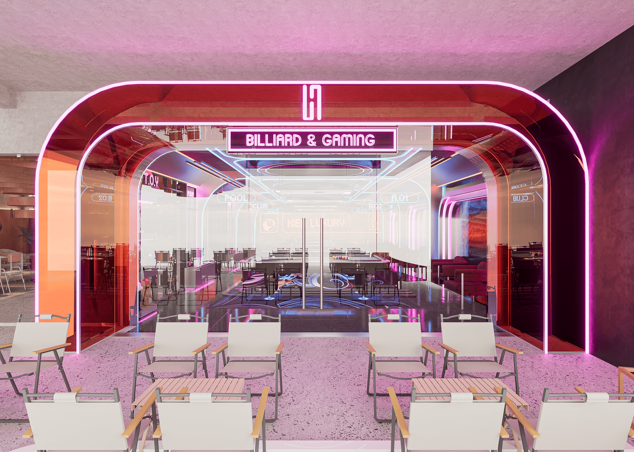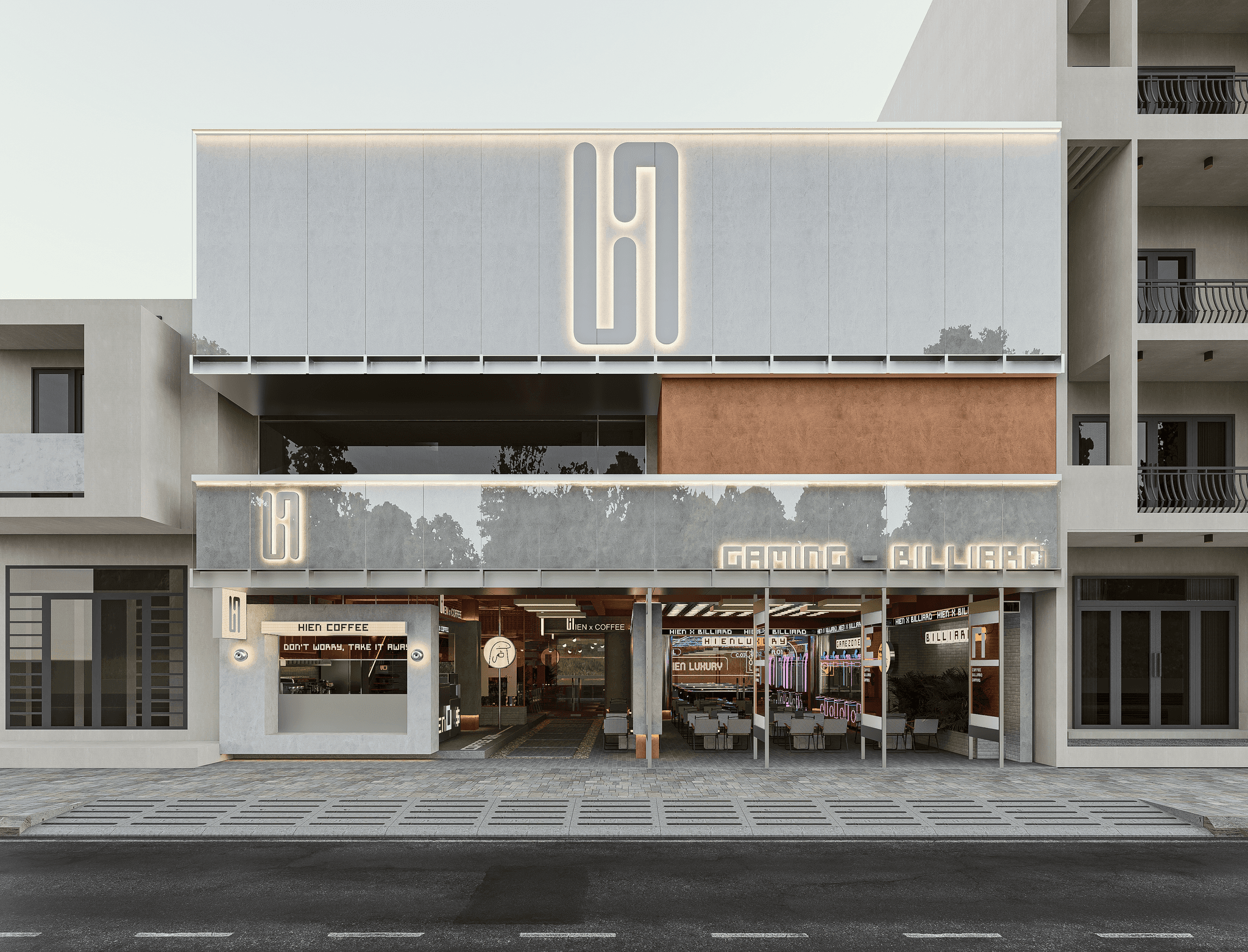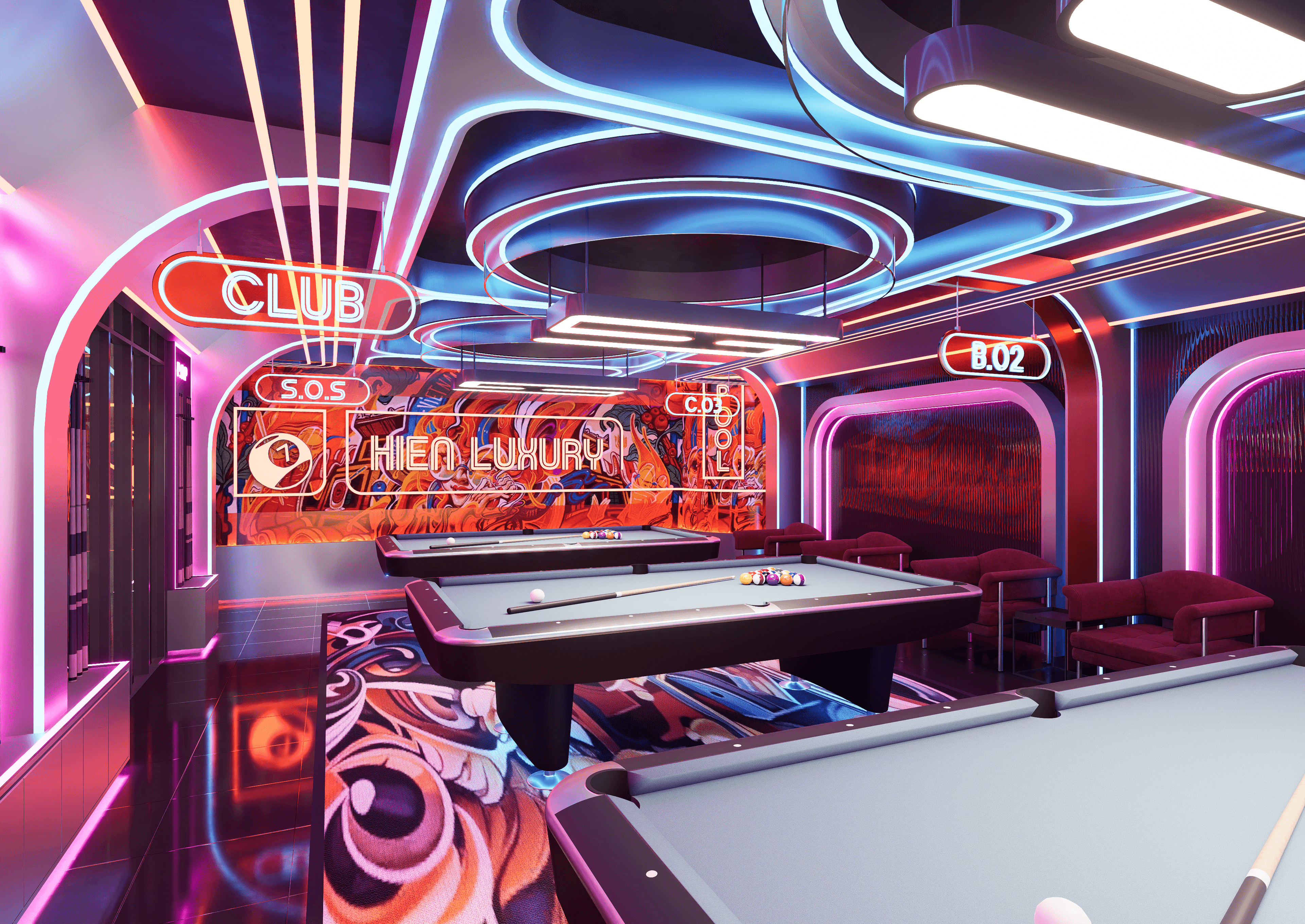 Hiển Luxury Coffee & Bida là sự giao thoa giữa tương lai và hoài niệm. Khu vực Bida bừng sáng với sắc hồng neon, xanh dương, tím, gợi cảm giác sôi động như một đêm tiệc hiện đại. Trong khi đó, khu Coffee lại ấm áp với tông cam đất và ánh sáng dịu, mang lại cảm giác cân bằng, thư thái. Hai không gian đối lập hòa quyện, tạo nên một trải nghiệm thị giác và cảm xúc đầy biến hóa.