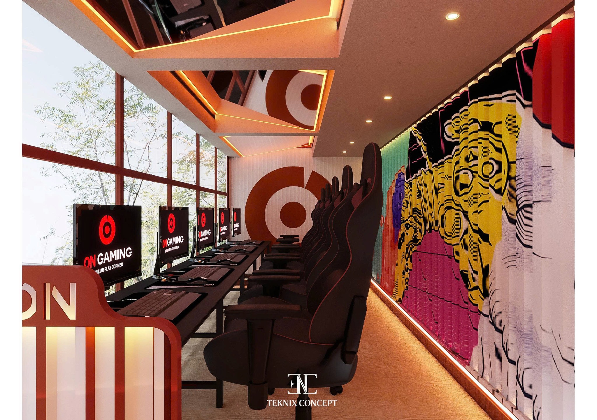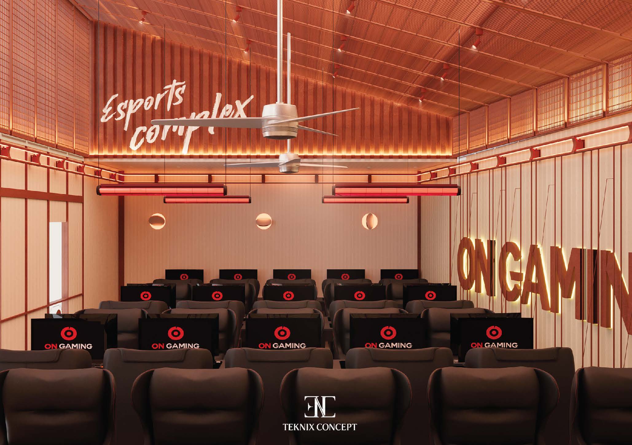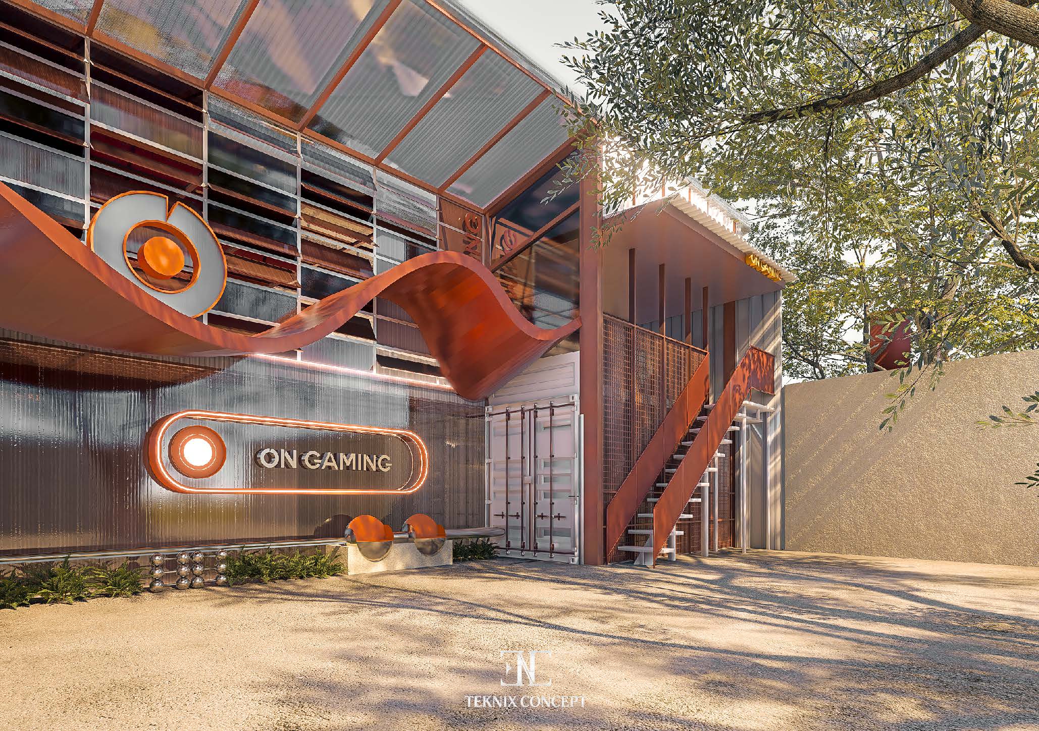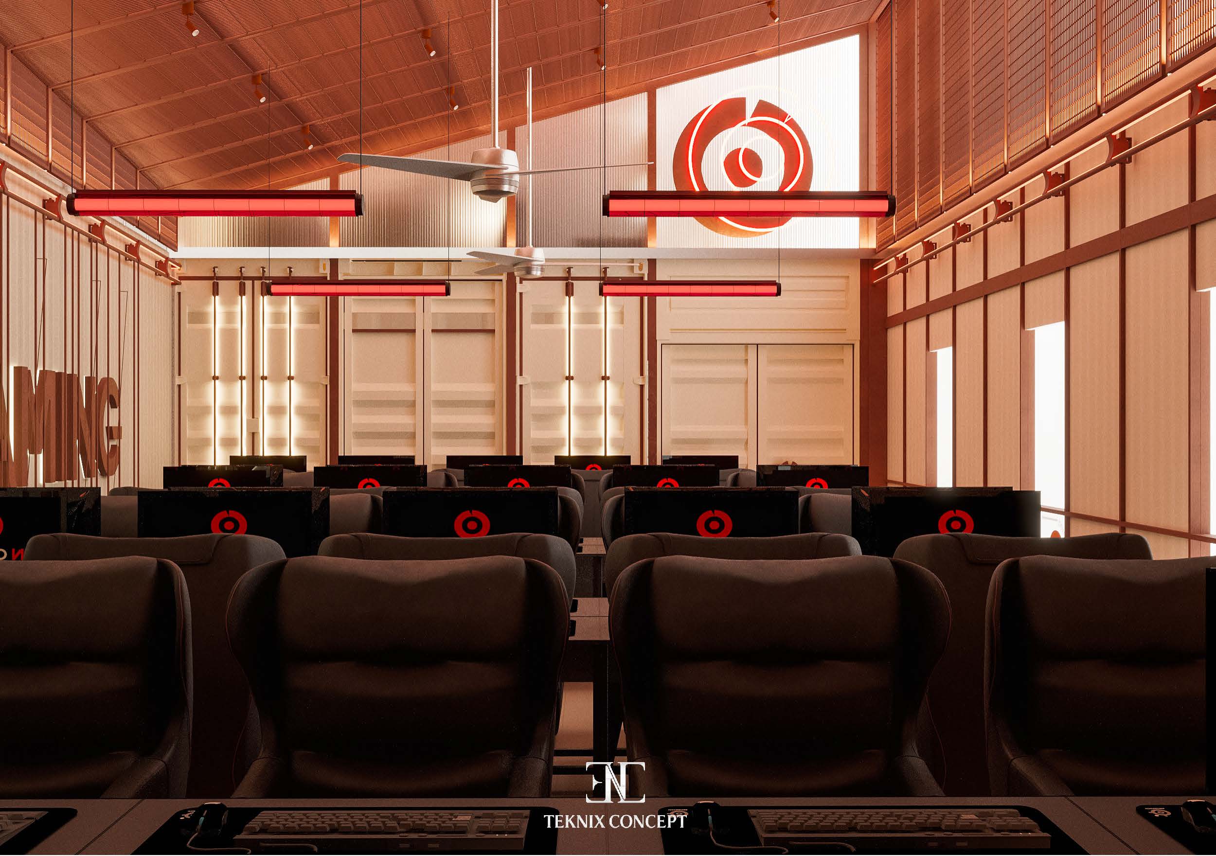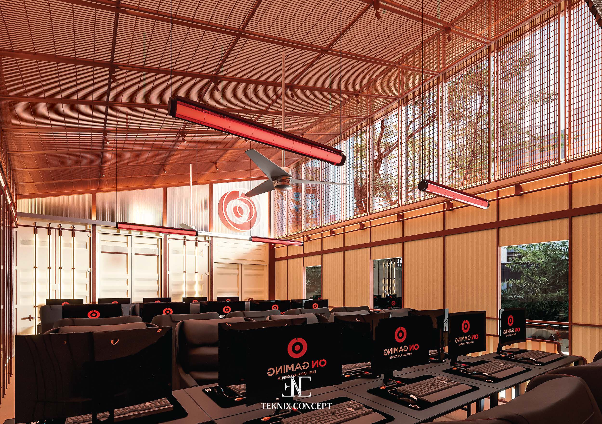ON Gaming là bước thử nghiệm mới trong việc tái định nghĩa không gian gaming center. TekNix Concept chọn phong cách industrial đương đại. được làm mềm bằng các đường cong lớn và lớp polcarbonate xuyên sáng. Không gian bên trong tối giản. tập trung vào trải nghiệm thị giác và cảm xúc người chơi. kết hợp ánh sáng ấm và nhịp điệu trần đồng bộ để tạo bầu không khí cuốn hút và giàu năng lượng.