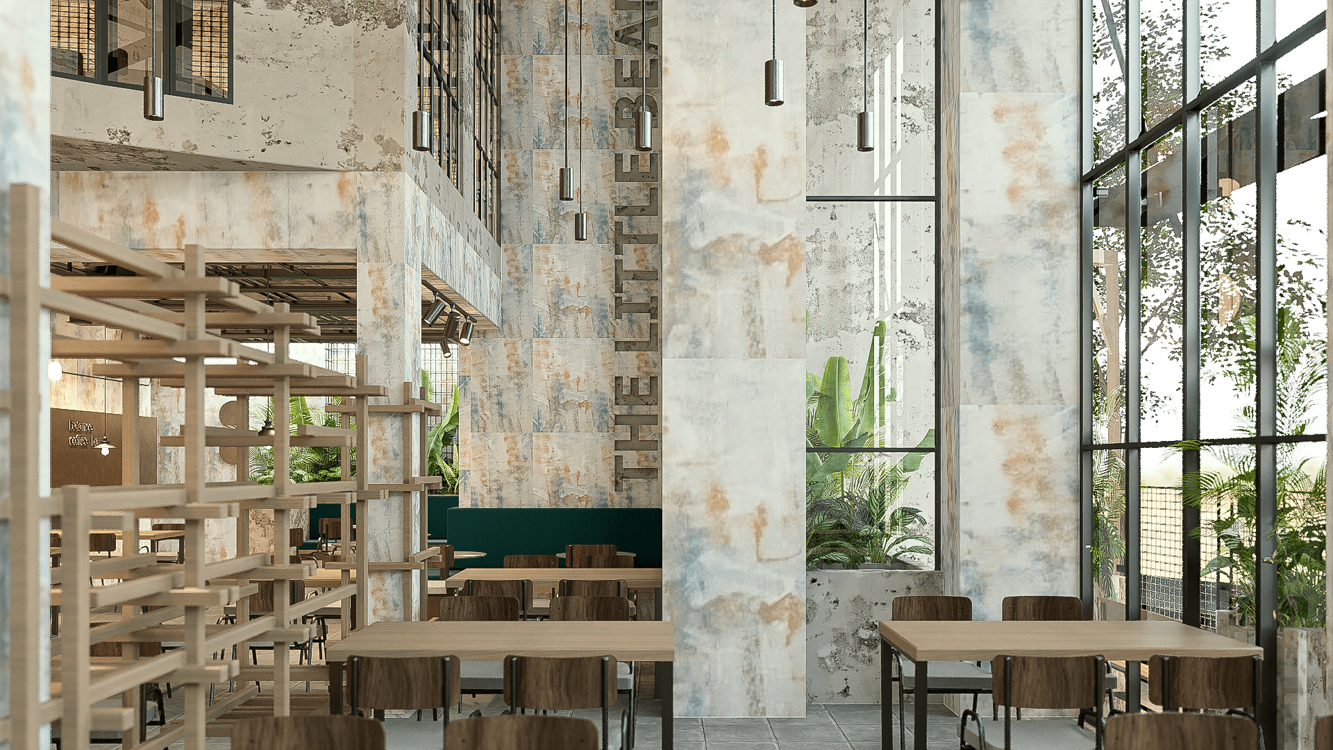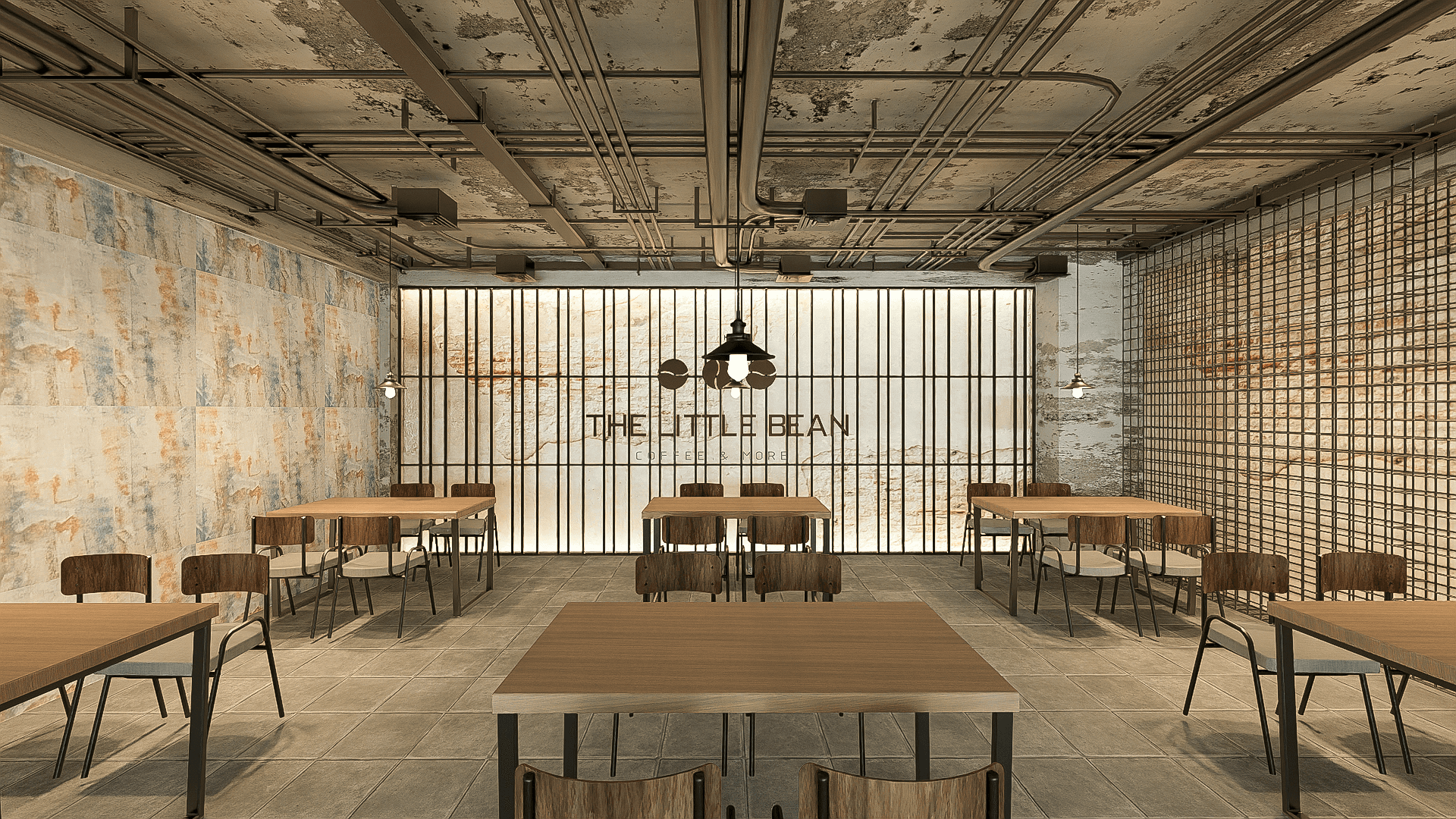The Little Bean là quán cà phê mang phong cách Tropical Rustic Industrial, hòa quyện giữa nét thô mộc công nghiệp và hơi thở nhiệt đới xanh mát. Không gian mở, ánh sáng tự nhiên, vật liệu chân thực — tạo nên cảm giác thư giãn, gần gũi và đầy cá tính.