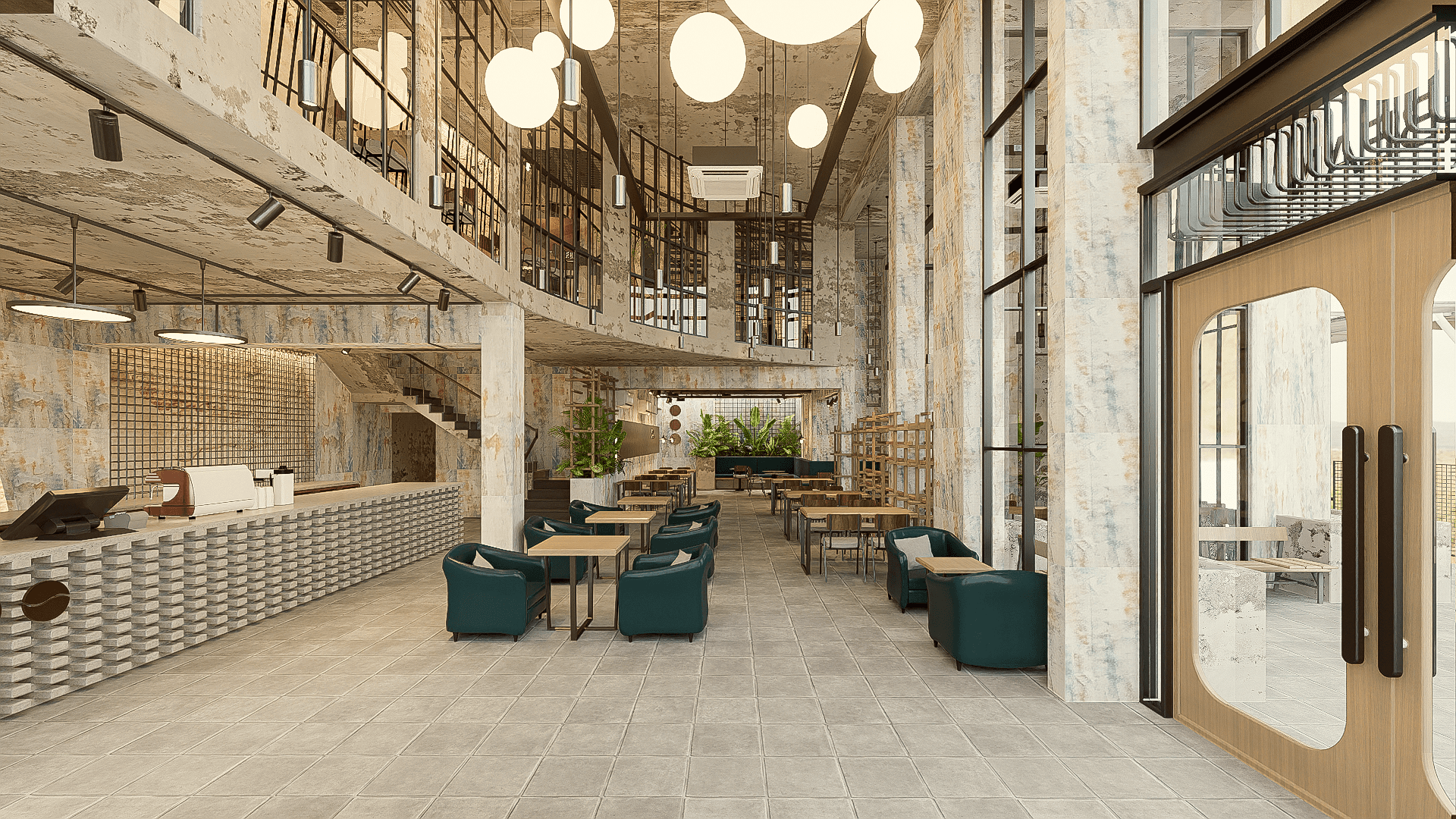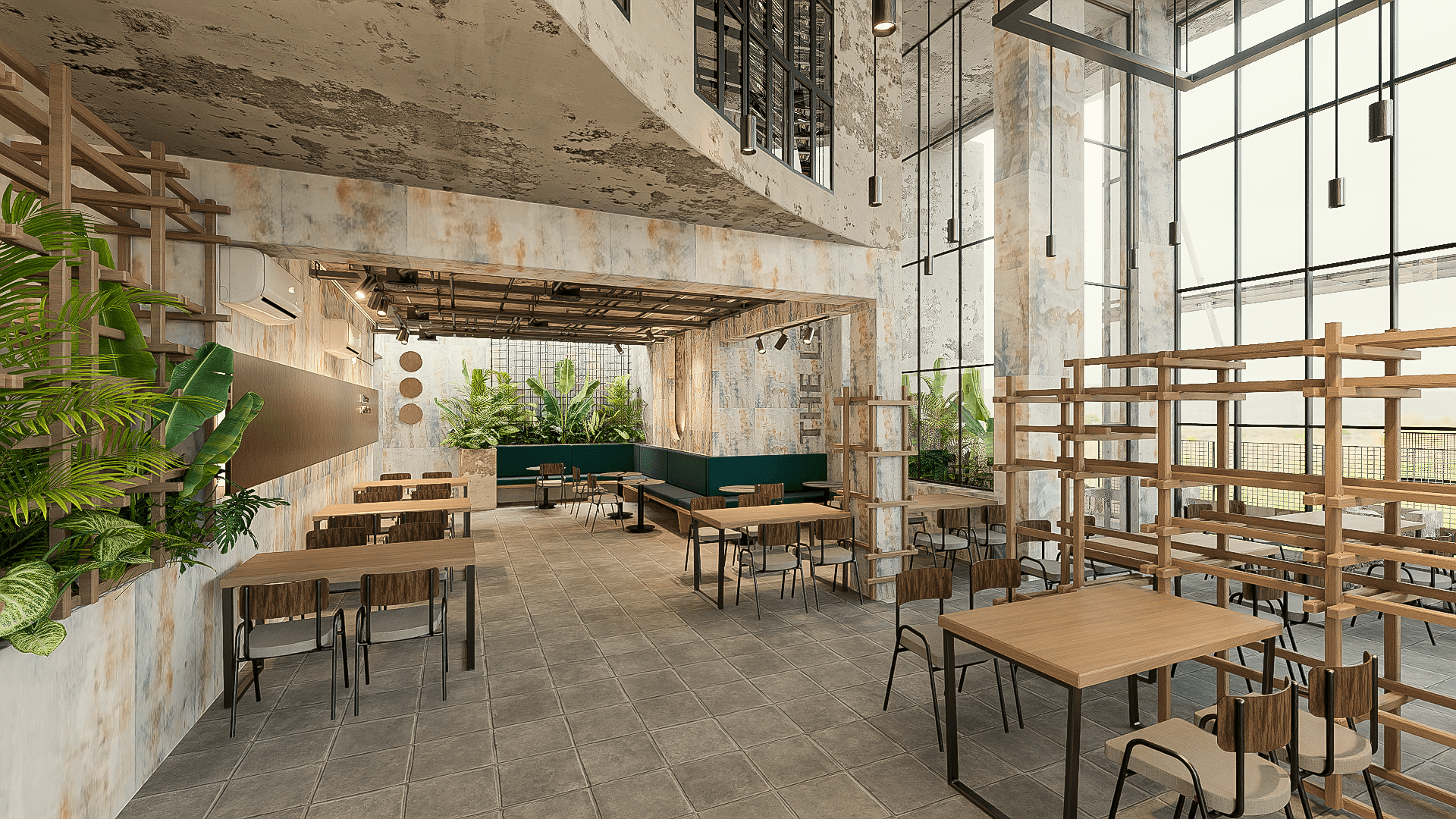 Kiến tạo bản sắc không gian: Giữ lại trần cao, khung cửa và kết cấu bê tông cũ, kết hợp vật liệu tự nhiên để tôn vinh vẻ đẹp nguyên bản — mộc mạc mà vẫn đậm dấu ấn thời gian.
