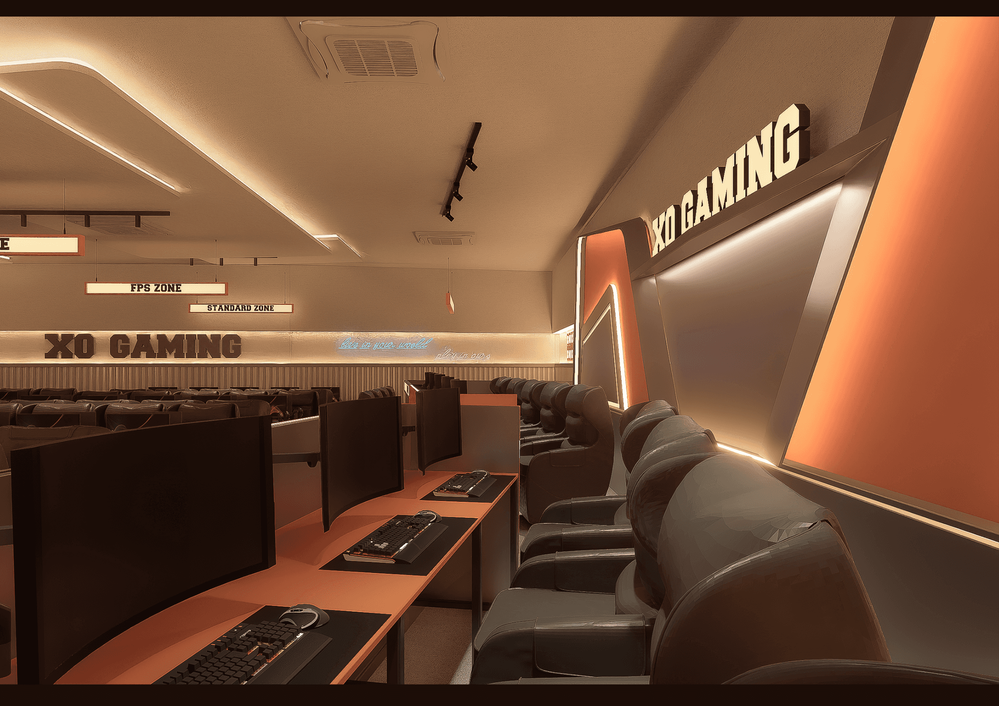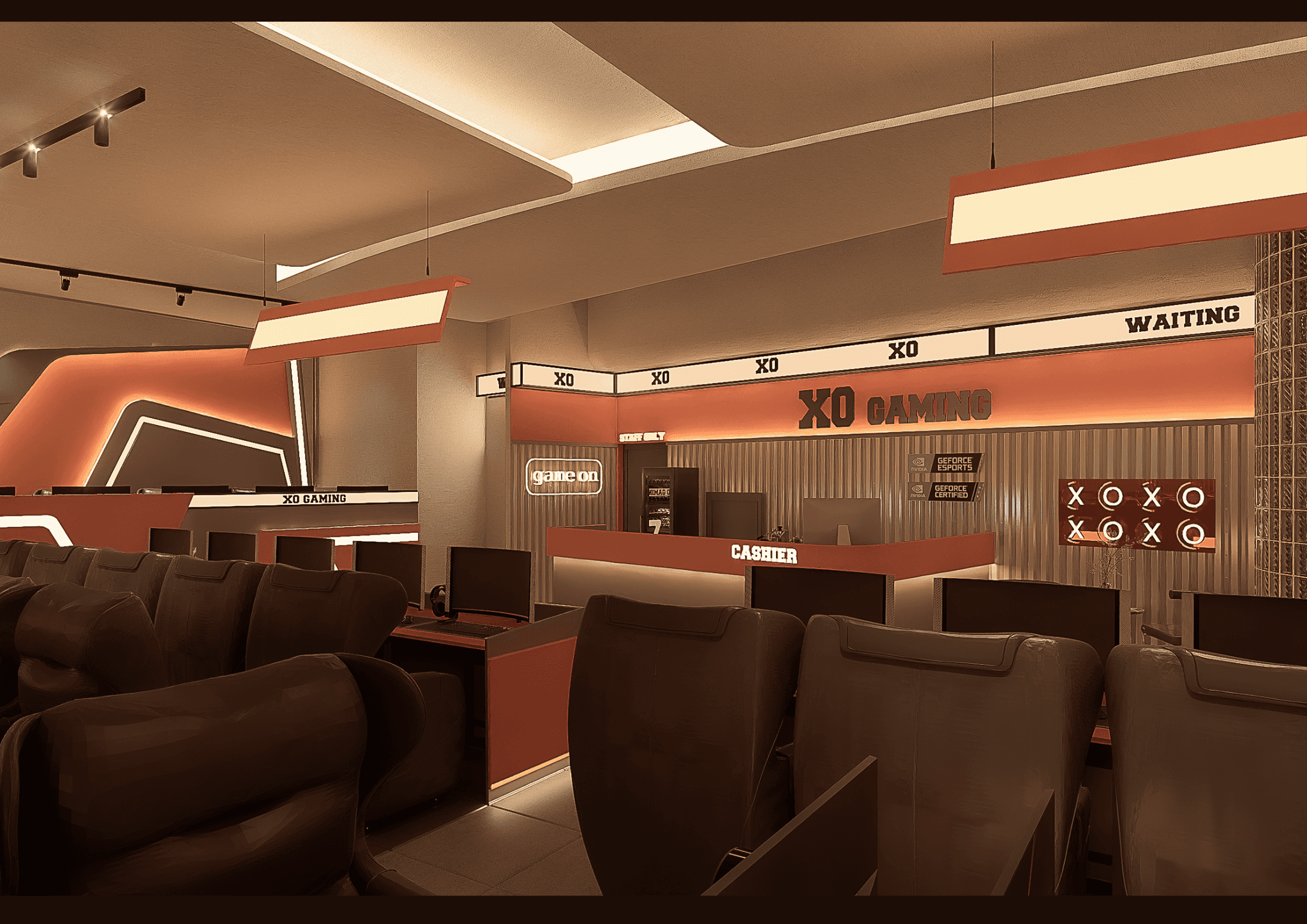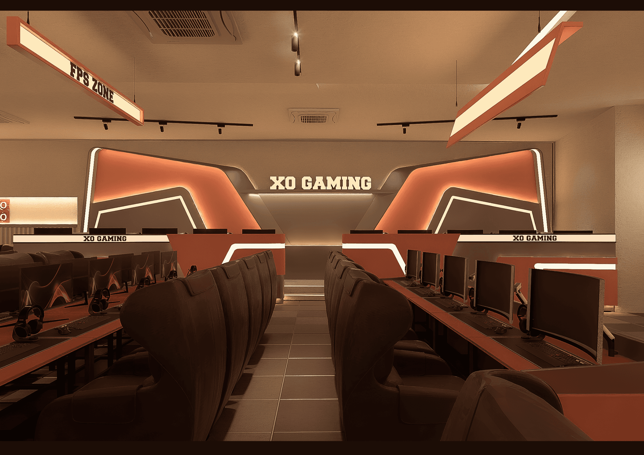 XO GAMING mang phong cách Modern Industrial kết hợp E-Sports Aesthetic, nơi ánh sáng LED, vật liệu kim loại và tông cam – xám hiện đại hòa quyện, tạo nên không gian năng động, mạnh mẽ và đậm chất công nghệ dành cho game thủ.