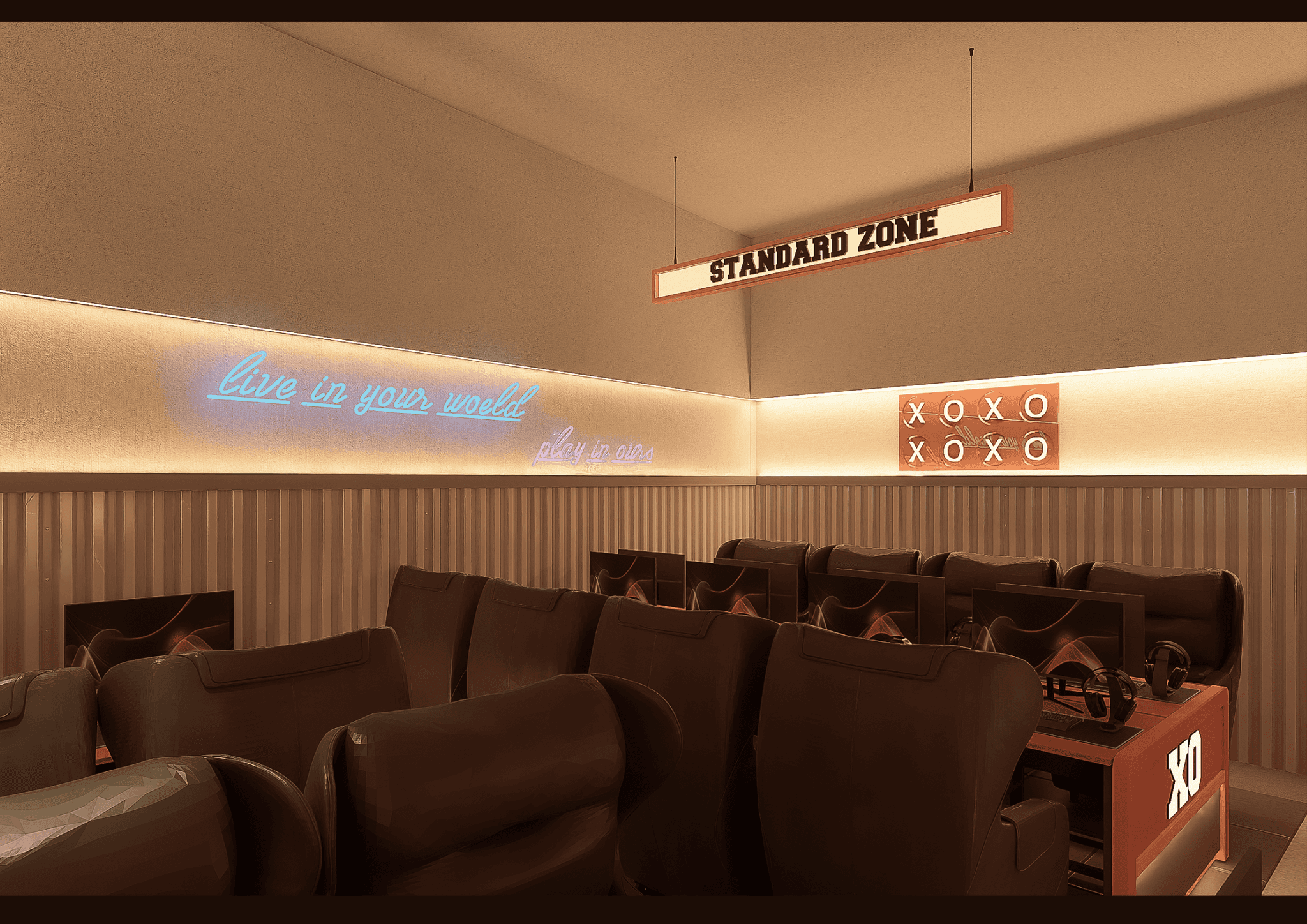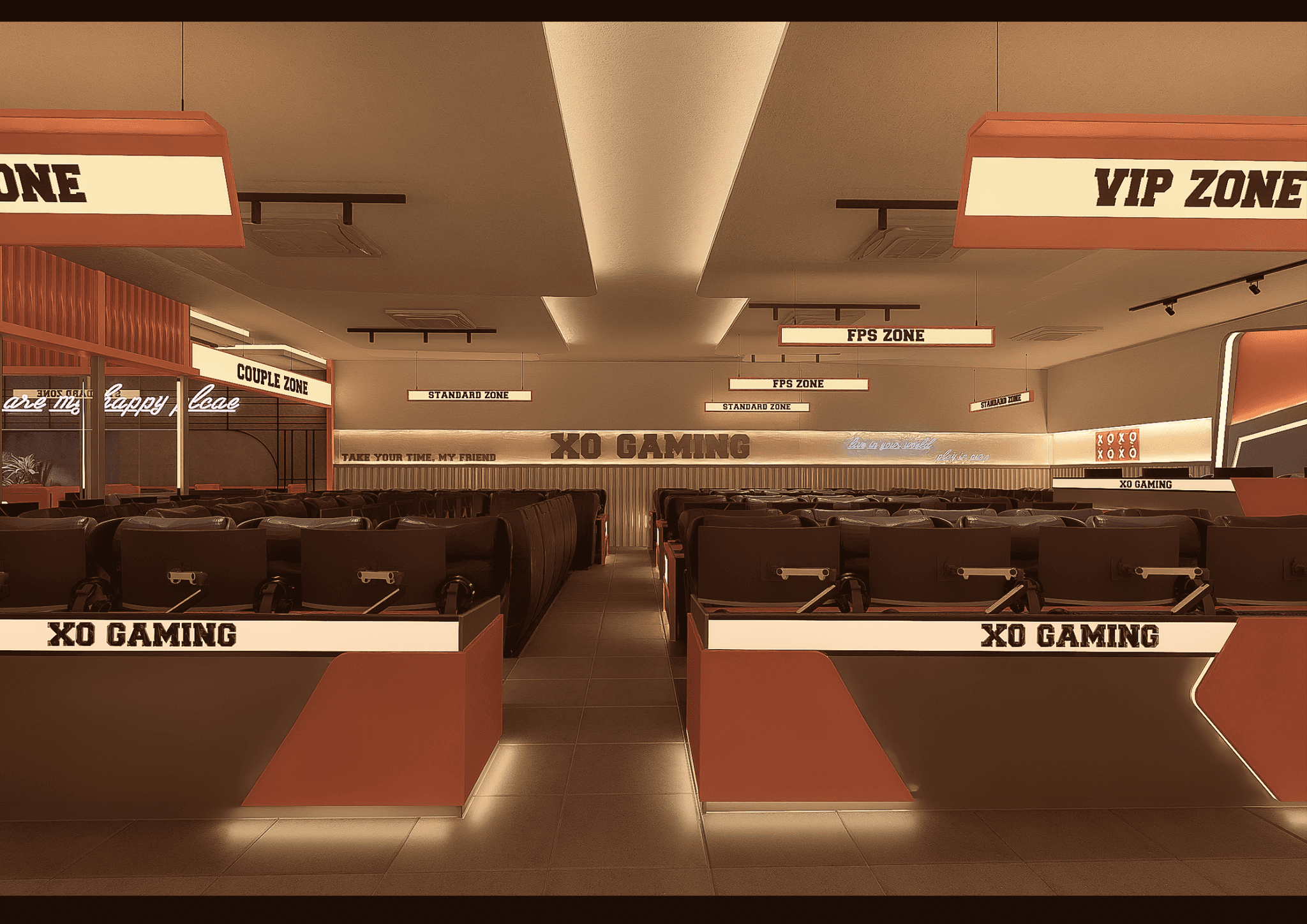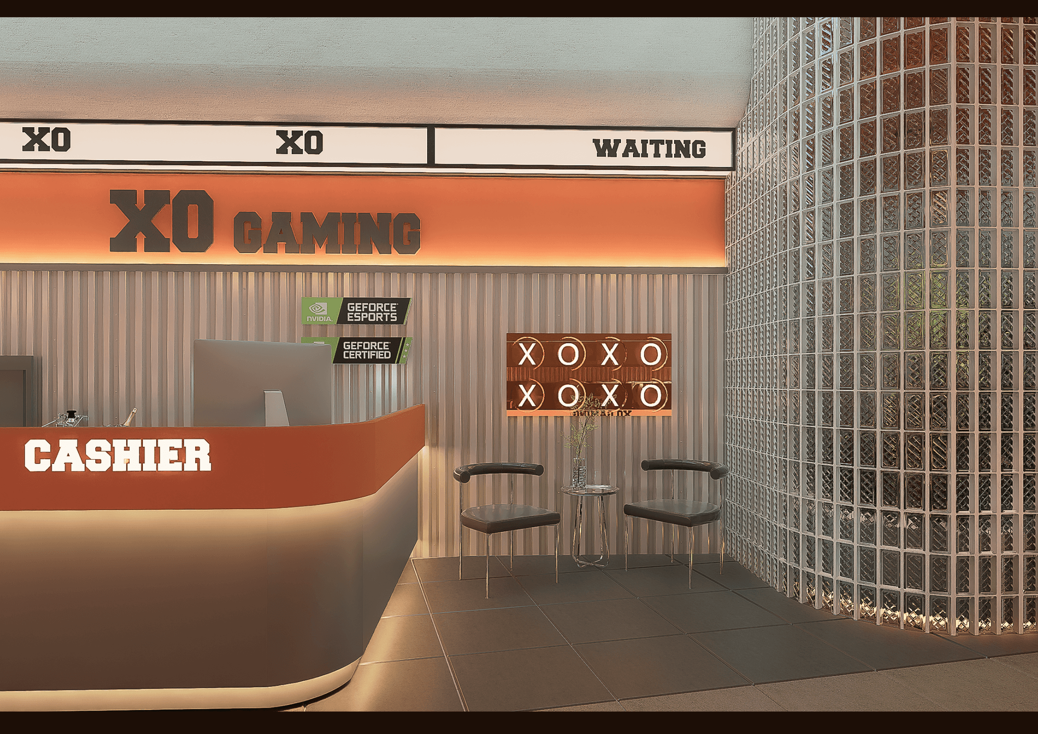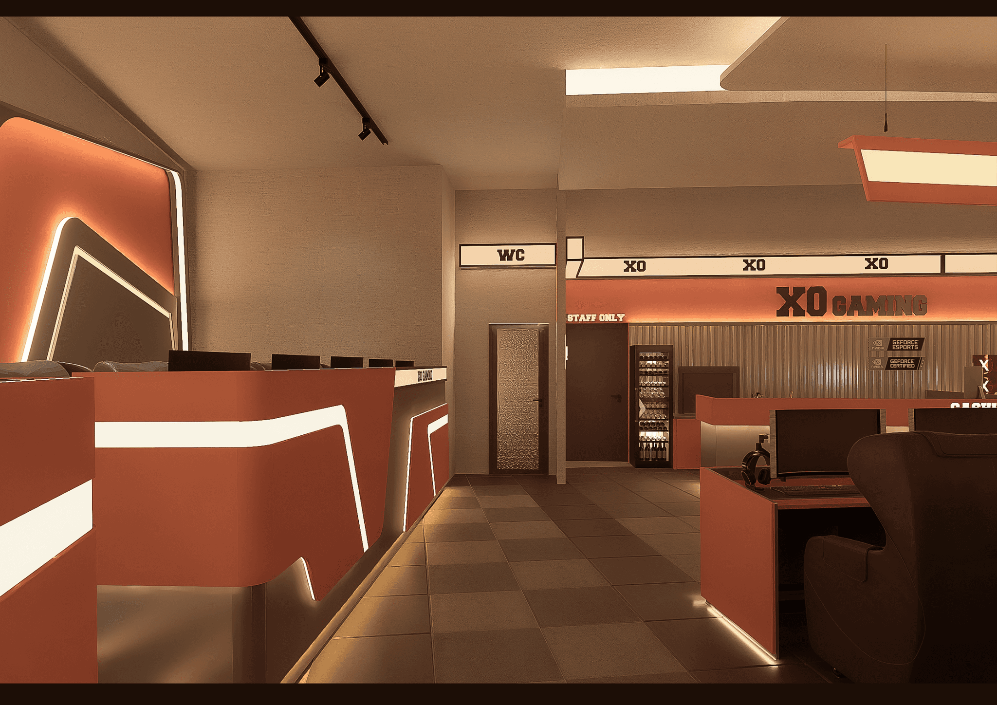 XO GAMING mang phong cách Modern Industrial kết hợp E-Sports Aesthetic, nơi ánh sáng LED, vật liệu kim loại và tông cam – xám hiện đại hòa quyện, tạo nên không gian năng động, mạnh mẽ và đậm chất công nghệ dành cho game thủ.