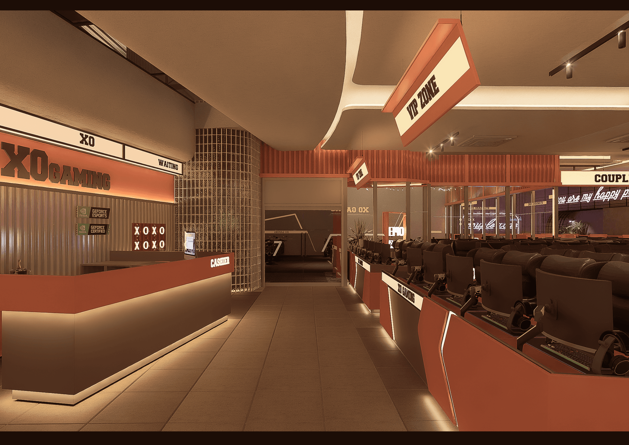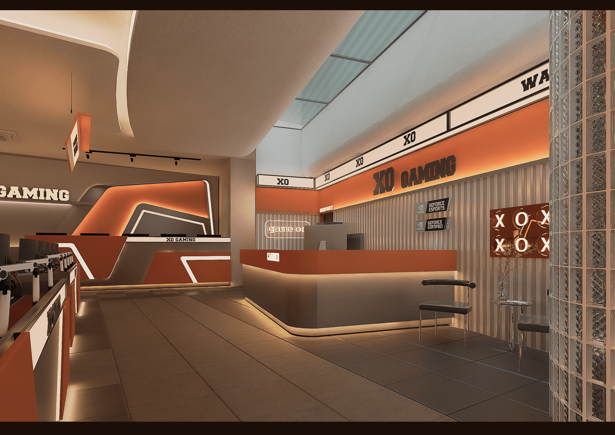 Kiến tạo bản sắc không gian: Không gian mang đậm tinh thần Cyber-Industrial, sử dụng hình khối mạnh mẽ, ánh sáng tương phản và tông cam–đen–ánh kim để truyền tải năng lượng, công nghệ và bản lĩnh tiên phong của thương hiệu XO Gaming.