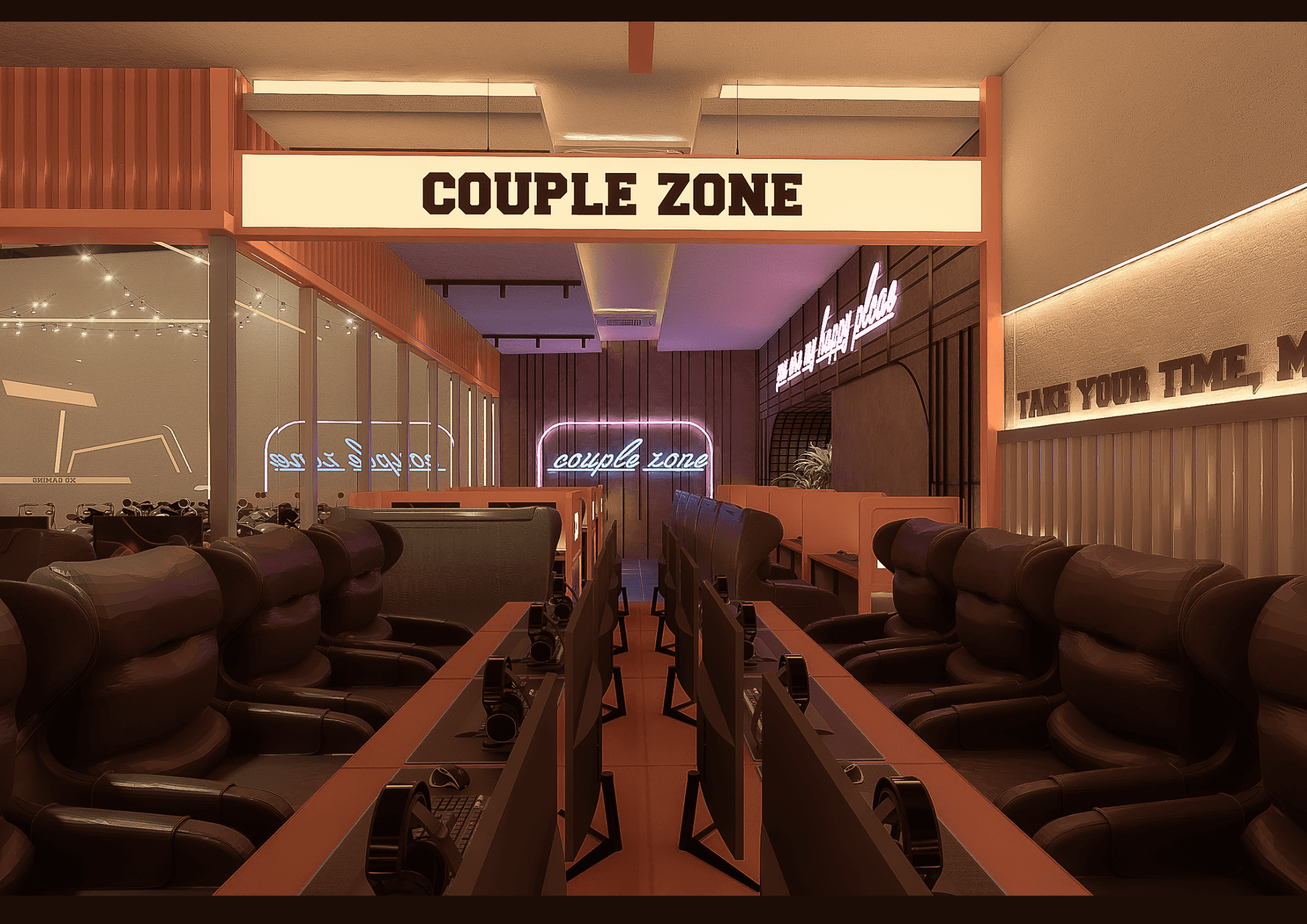 Không gian gắn kết cảm xúc: Bố cục phân khu thông minh gồm Standard – Couple – VIP – FPS Zone, ánh sáng định hướng và chất liệu phản chiếu tạo nên trải nghiệm nhập vai, nơi người chơi cảm nhận rõ nhịp đập của năng lượng và kết nối trong thế giới game.